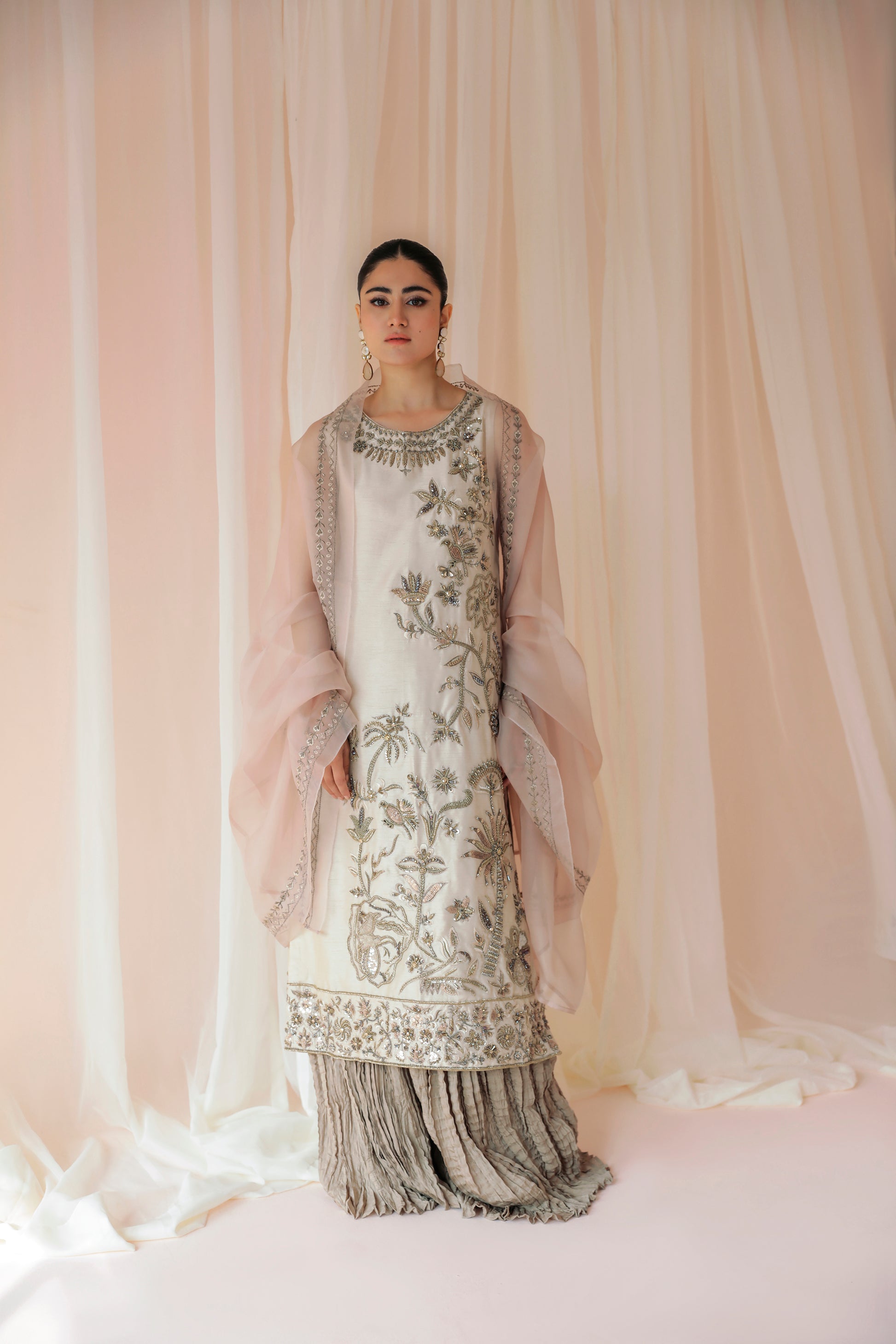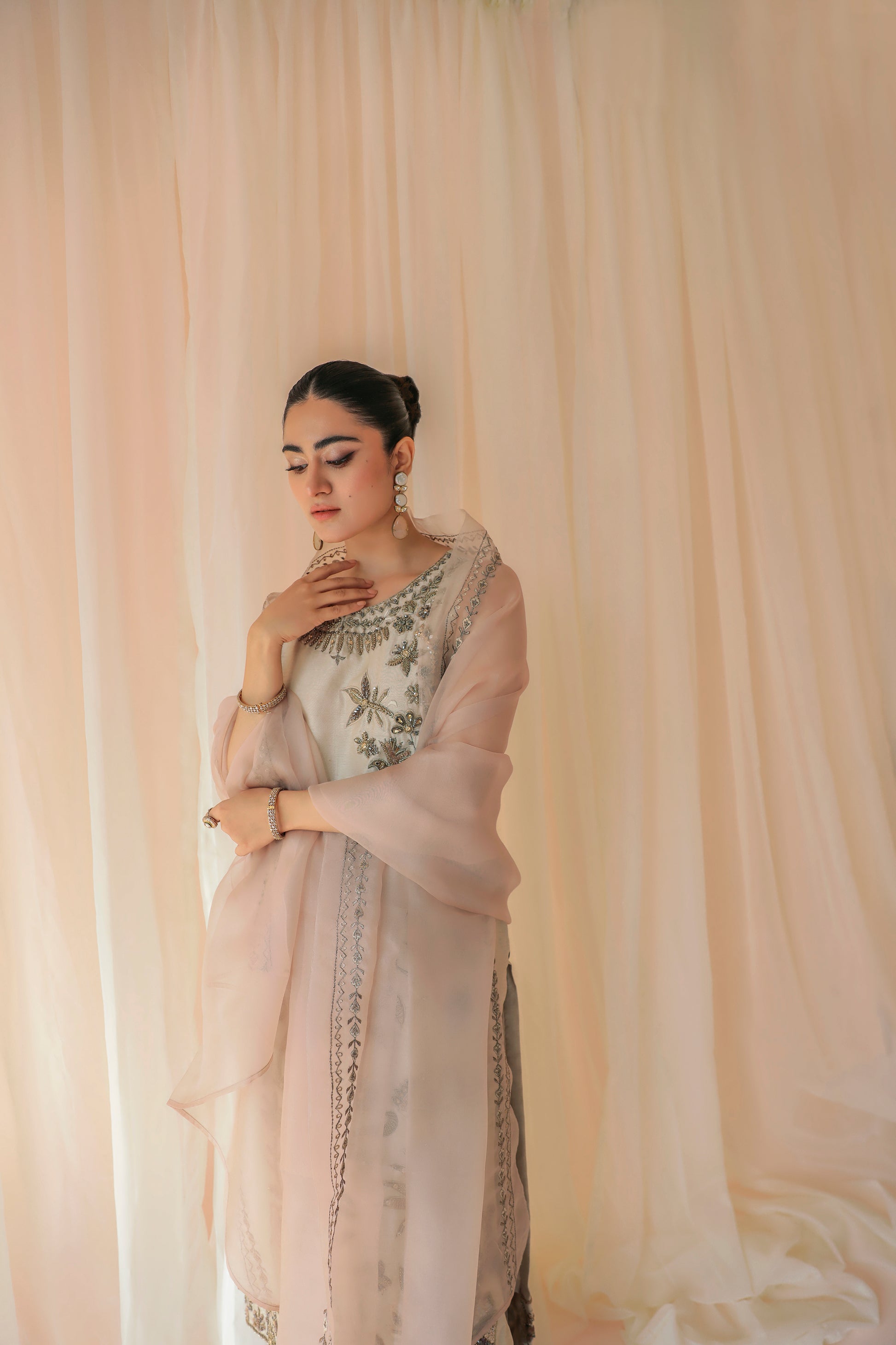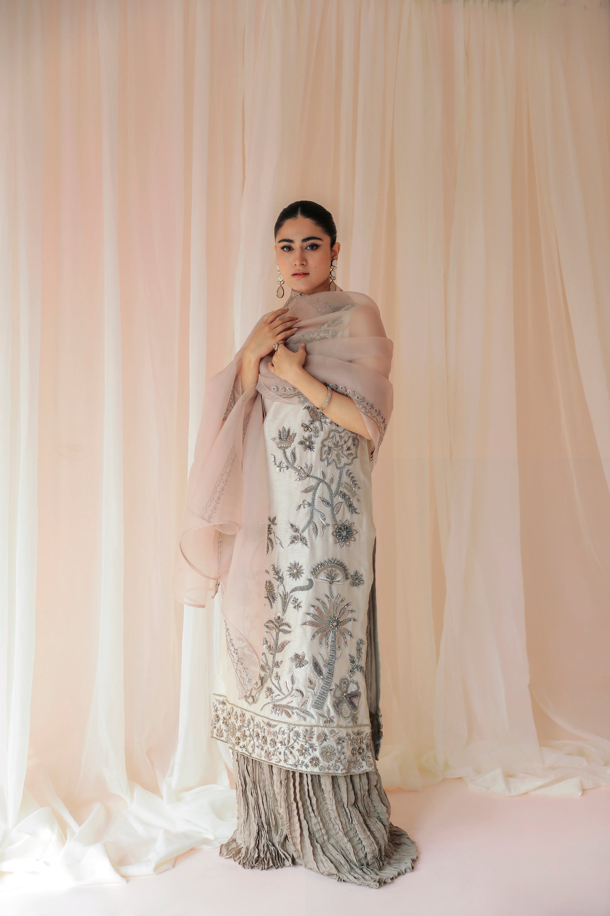 A modern take on a traditional long shirt adorned with a handful of creative embroidery and bling, effortlessly paired with crushed pants and orgazna dupatta.