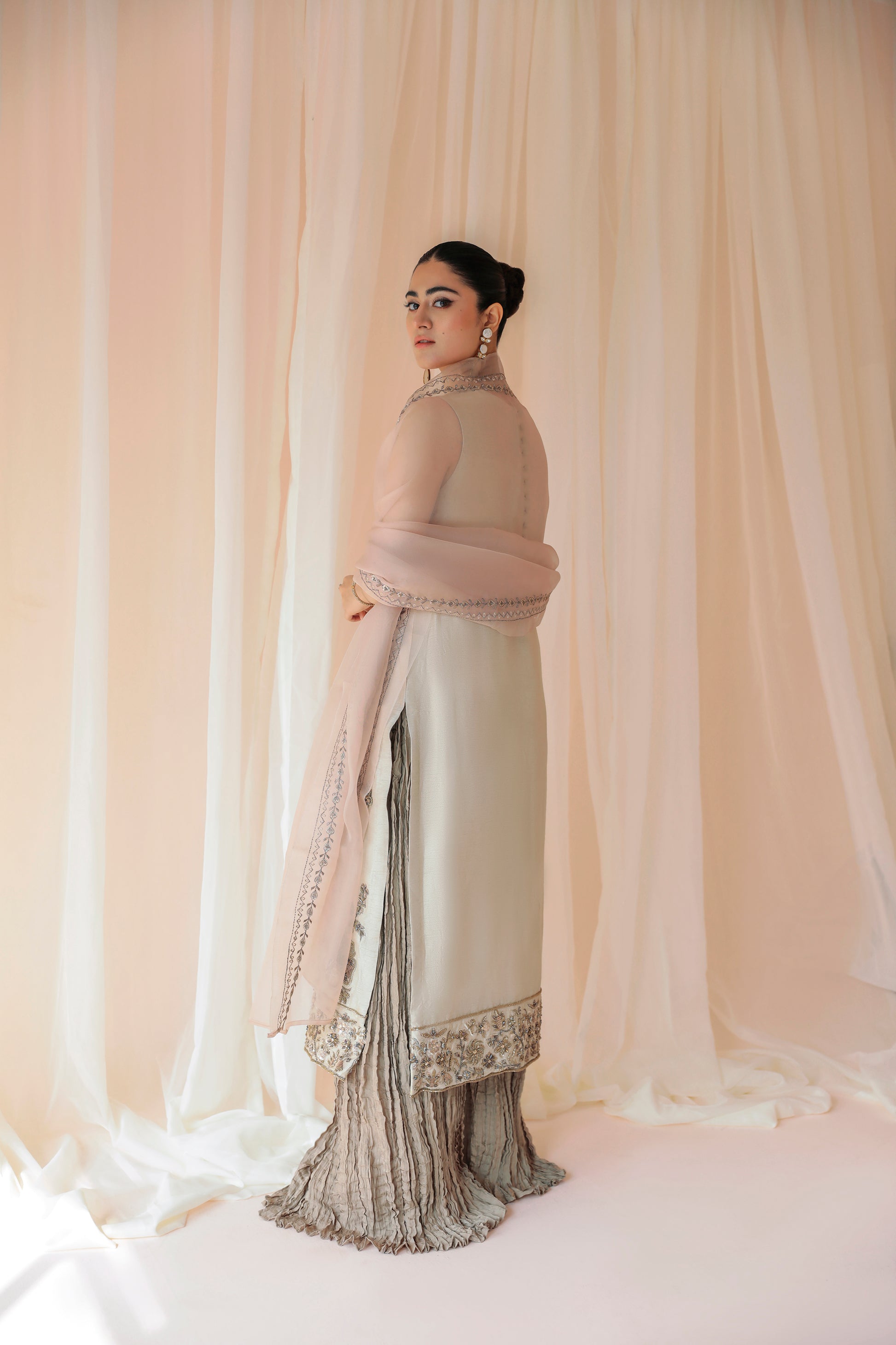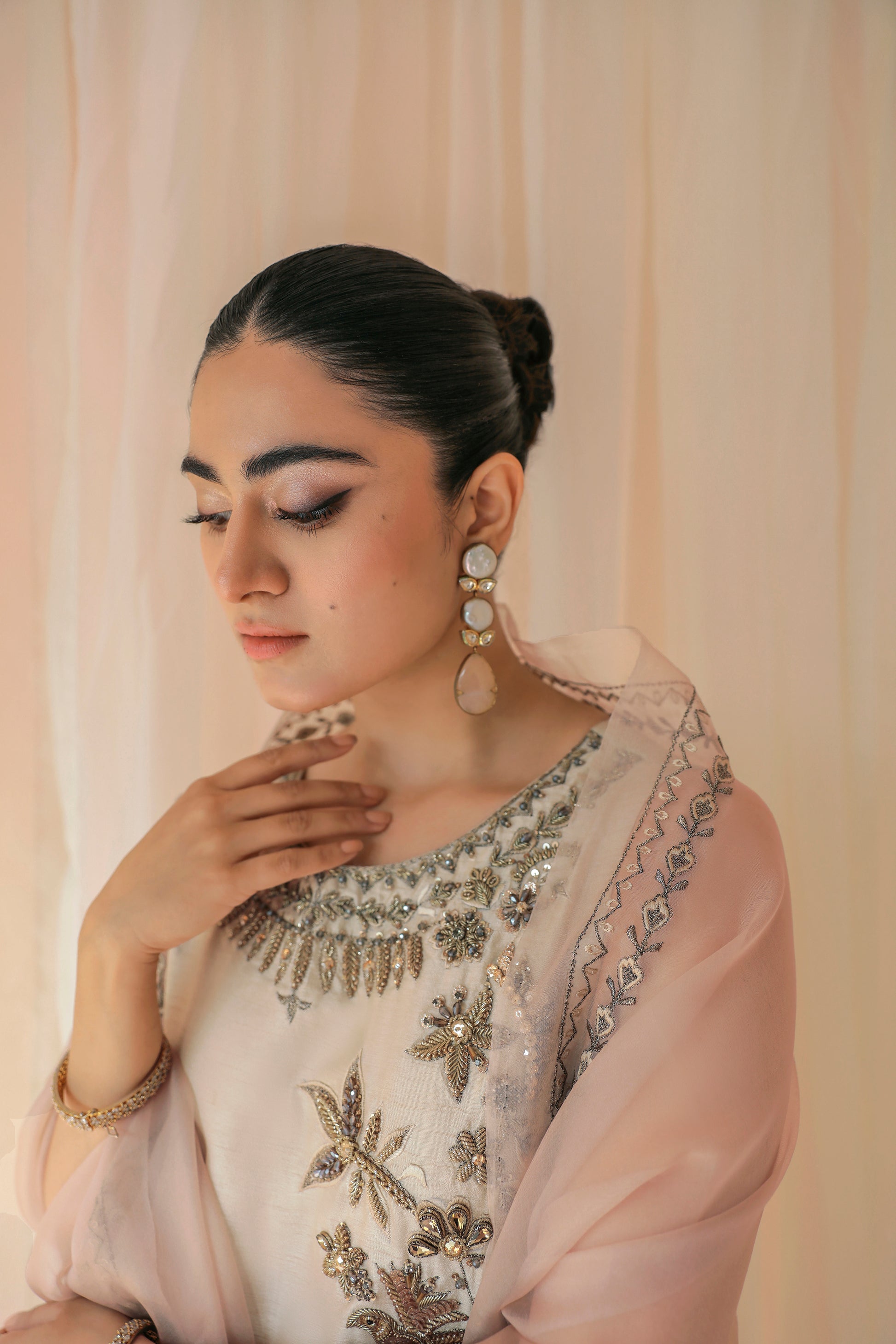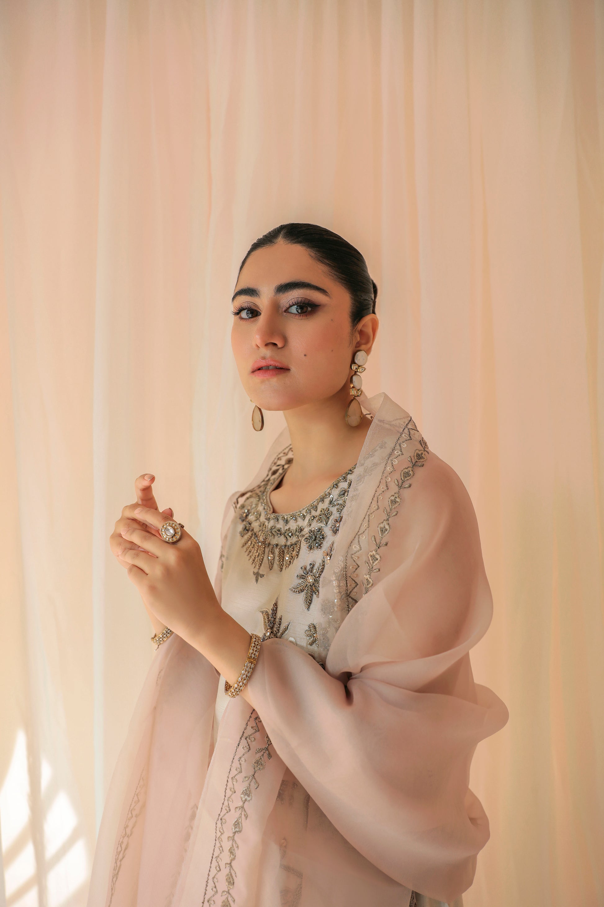 A modern take on a traditional long shirt adorned with a handful of creative embroidery and bling, effortlessly paired with crushed pants and orgazna dupatta.