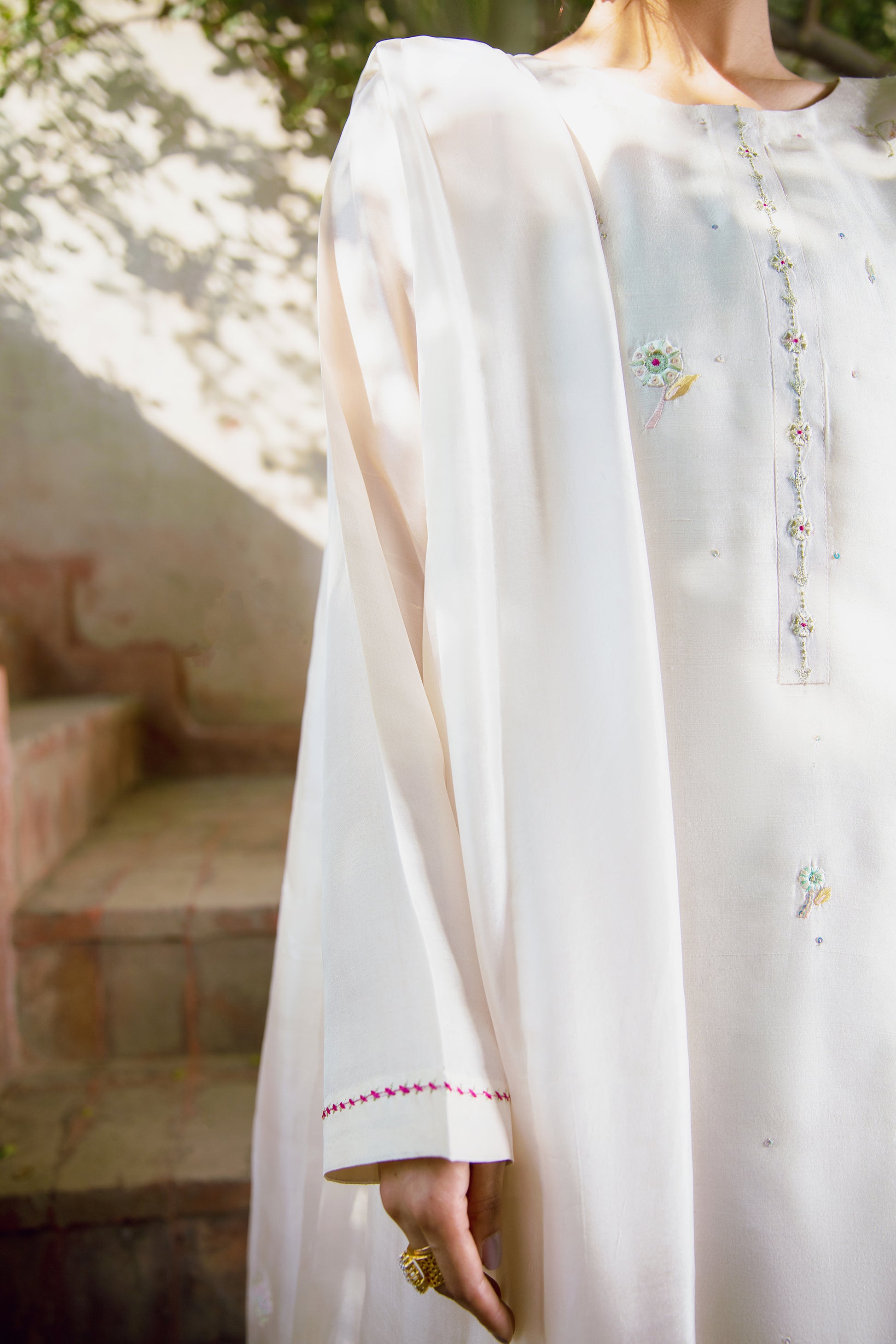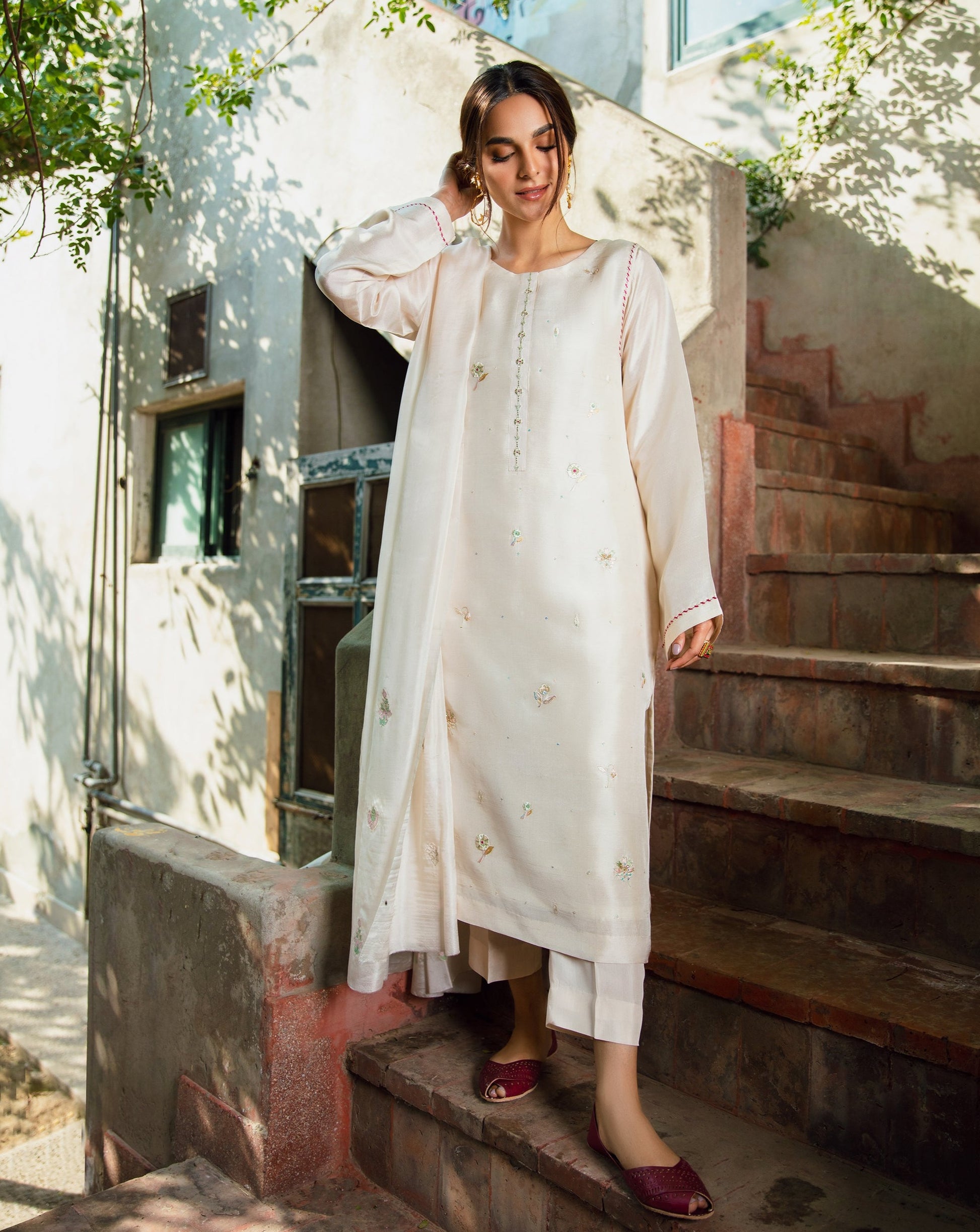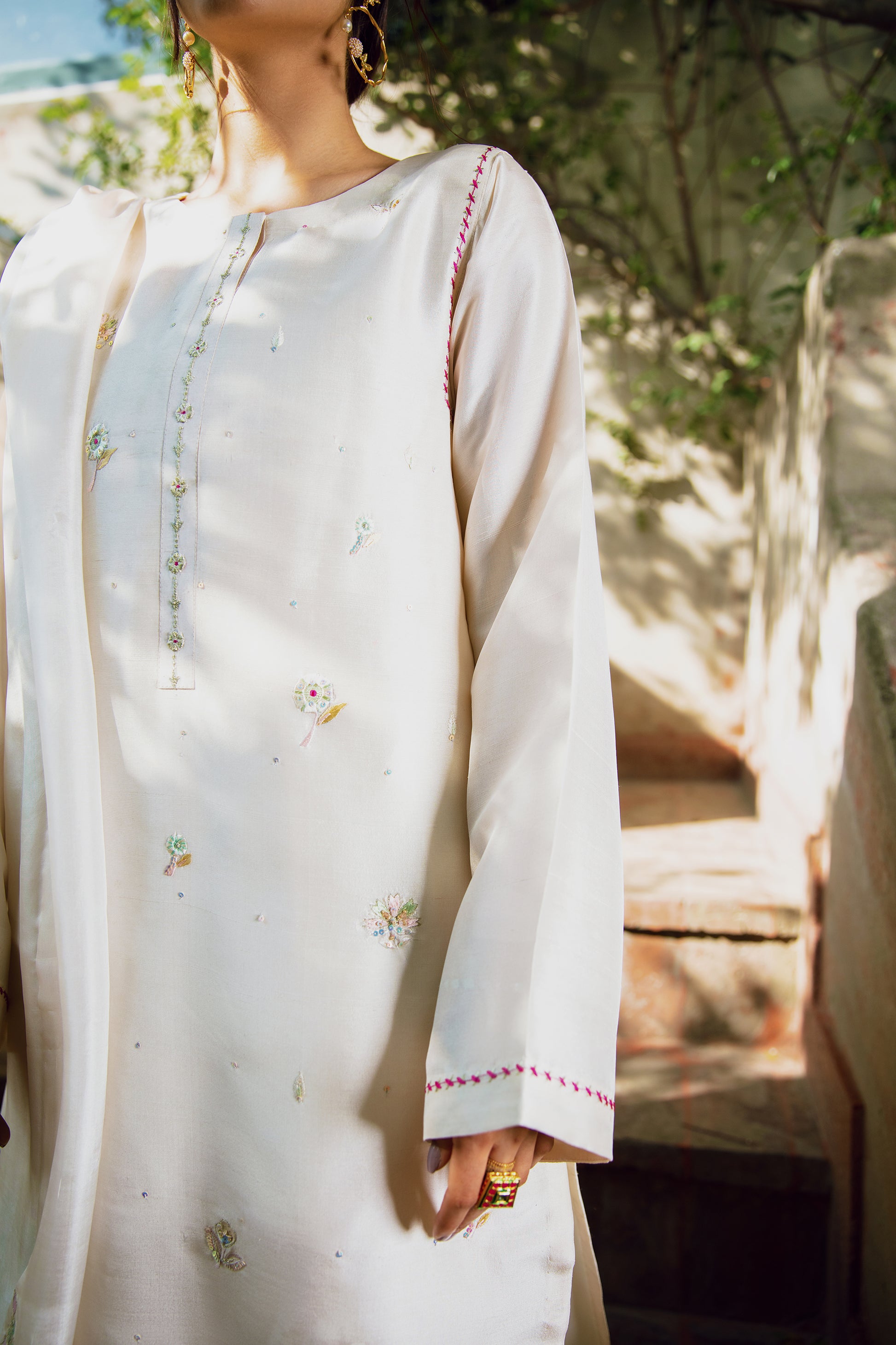 When talking about Meethi Eid, a traditional white kurti with ethnic detailing is all what comes in mind when given a thought. Keeping your preferences in notice, we’re offering you this exquisitely fine garb designed with artful floral motifs splashing all over the kurta ornamented with hand embellishment and embroidery to add a spark into this heavenly experience.