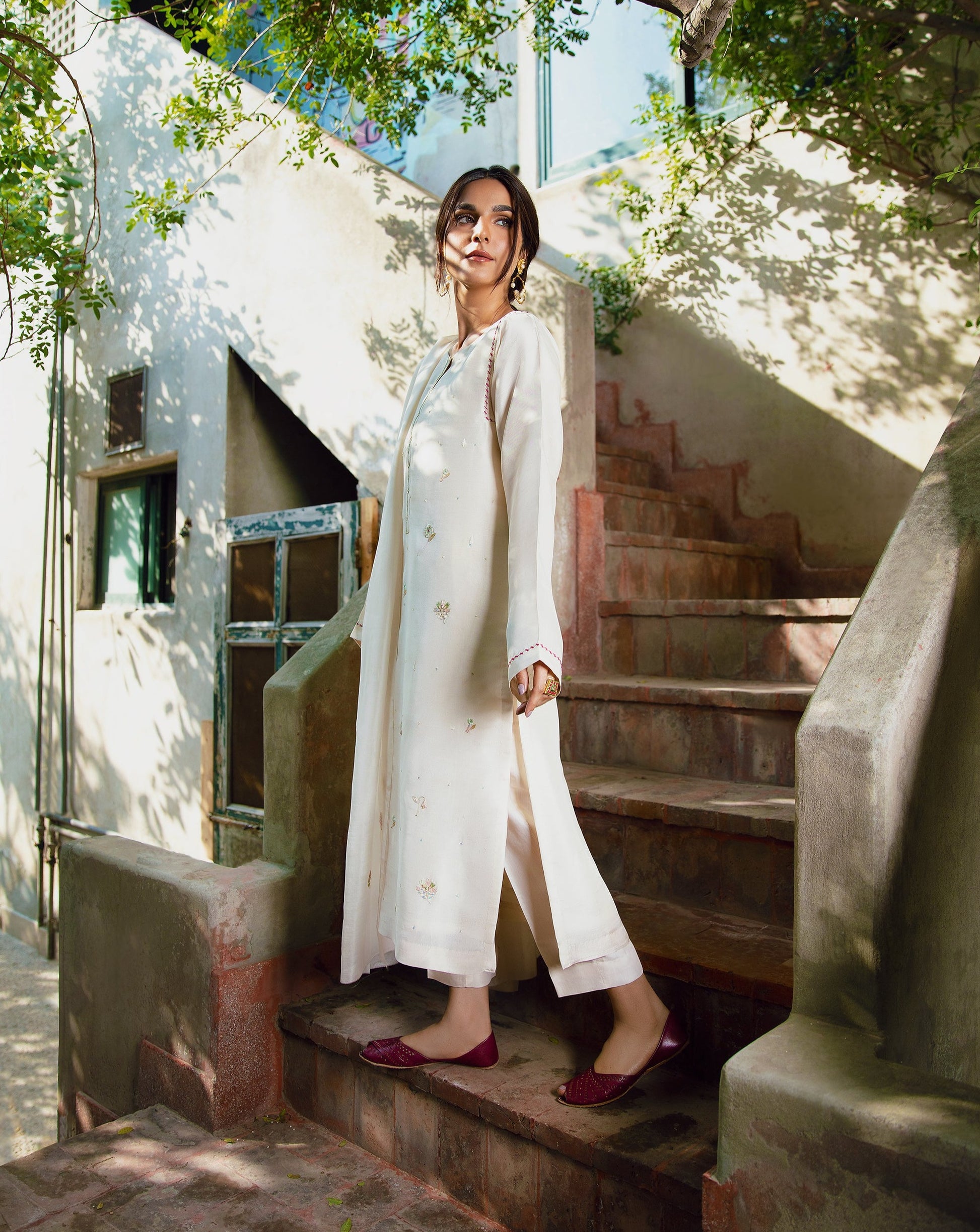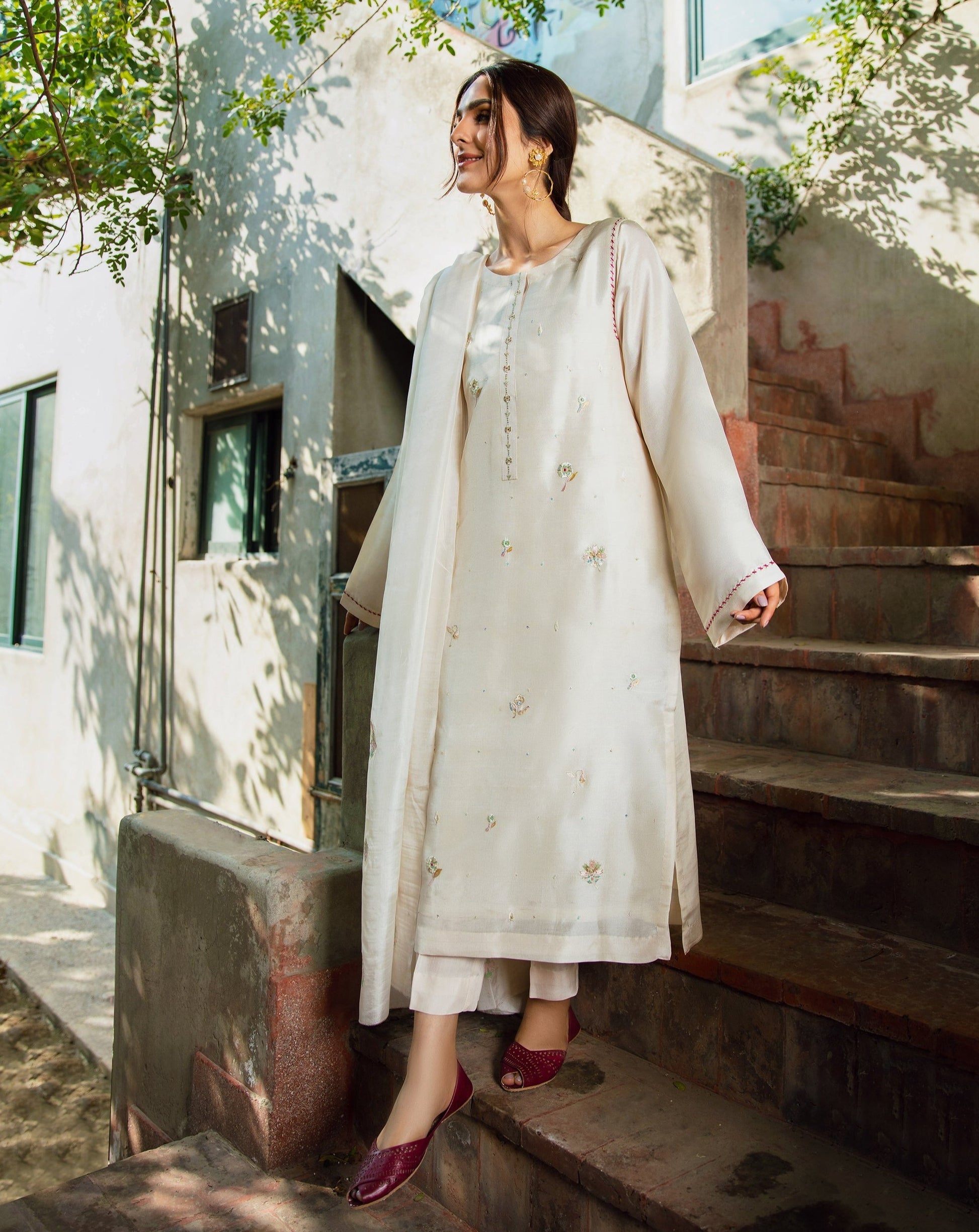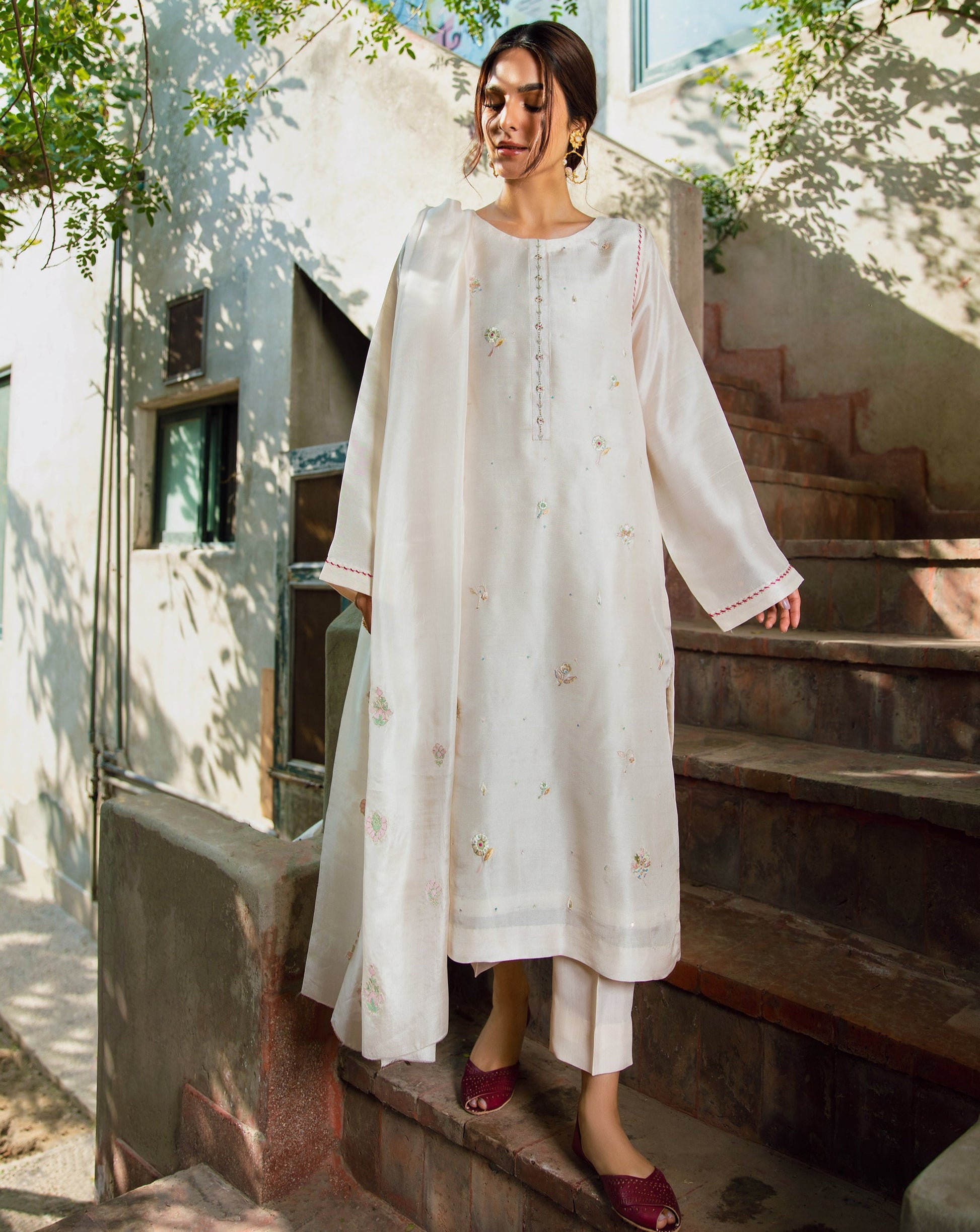 When talking about Meethi Eid, a traditional white kurti with ethnic detailing is all what comes in mind when given a thought. Keeping your preferences in notice, we’re offering you this exquisitely fine garb designed with artful floral motifs splashing all over the kurta ornamented with hand embellishment and embroidery to add a spark into this heavenly experience.