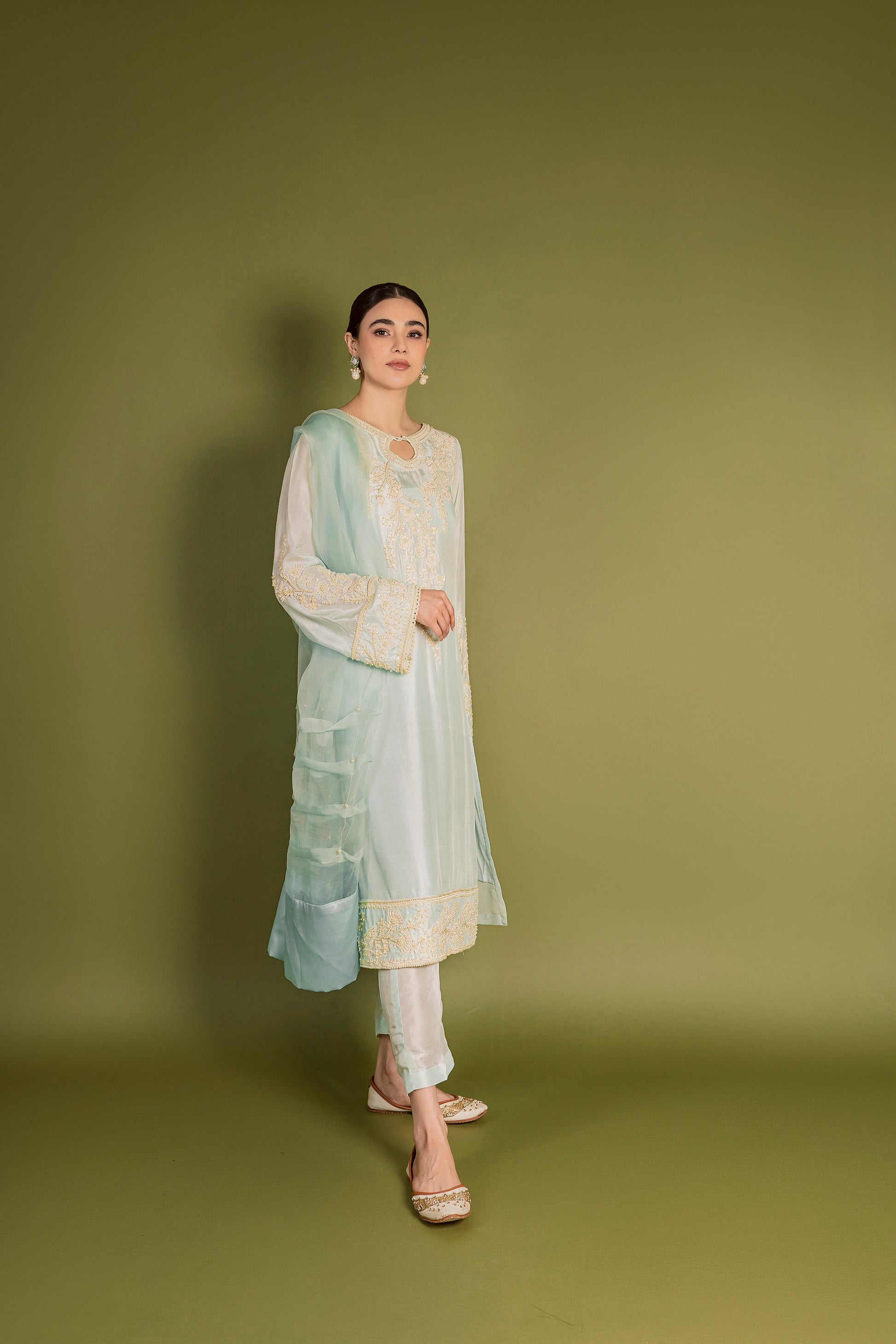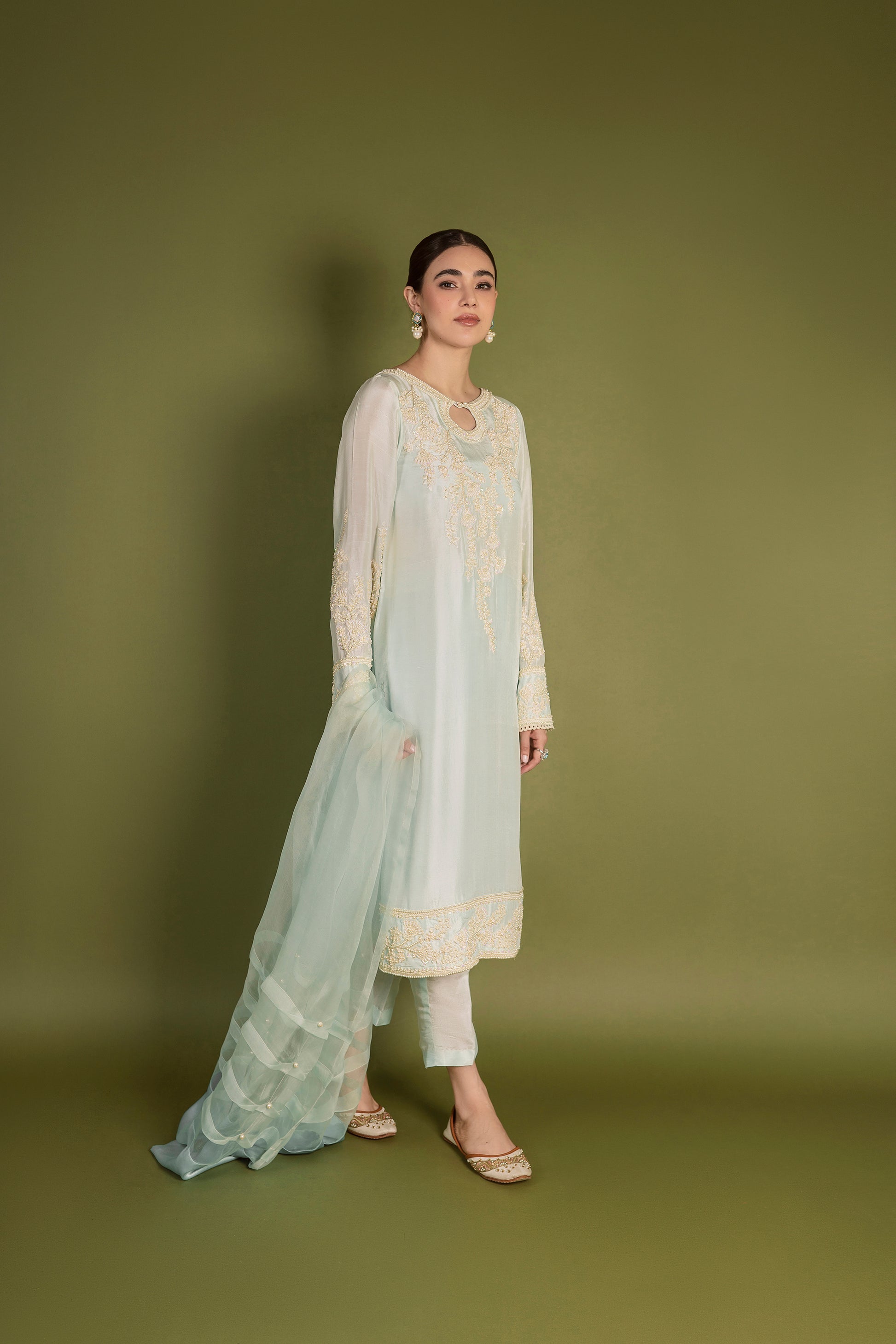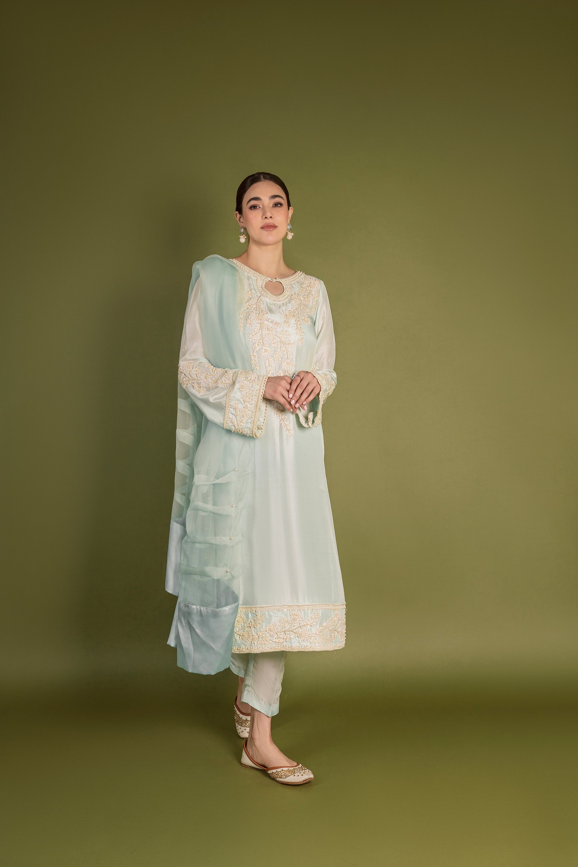 ‘ICE’ is a heavenly adorned master piece with an embroidered front, hemline and sleeves. It is coupled with straight pure raw silk pants and an exclusively pleated organza dupatta highlighted with pearls and finished with silk border.