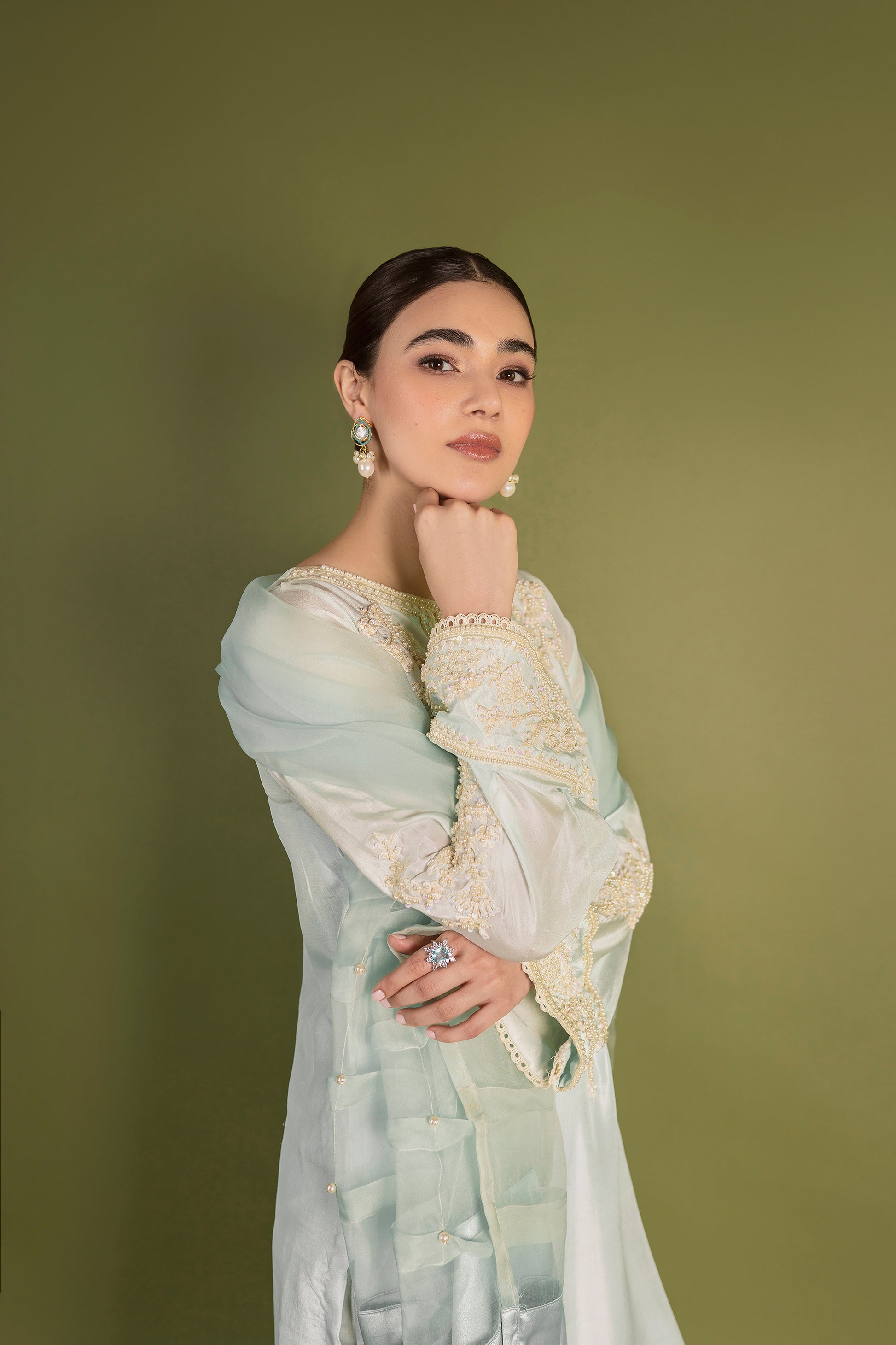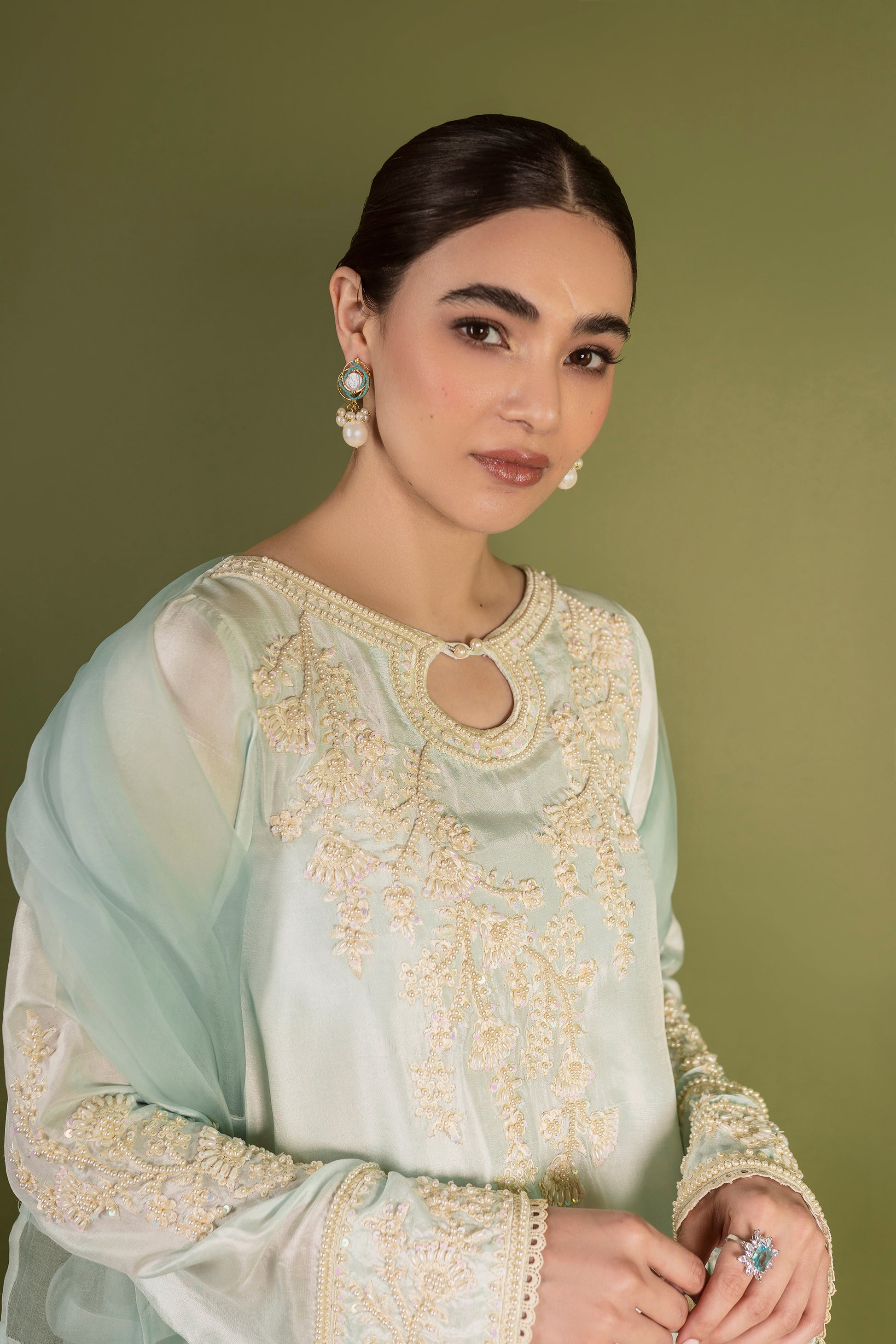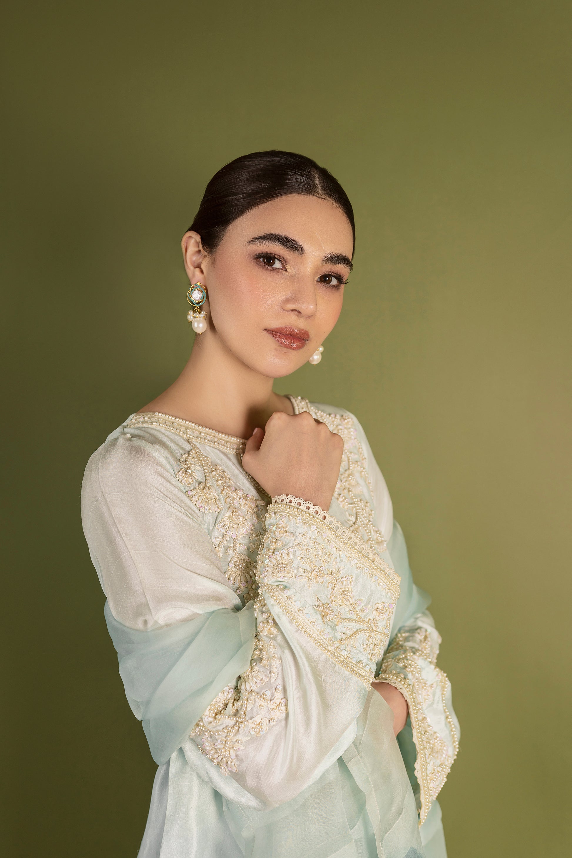 ‘ICE’ is a heavenly adorned master piece with an embroidered front, hemline and sleeves. It is coupled with straight pure raw silk pants and an exclusively pleated organza dupatta highlighted with pearls and finished with silk border.