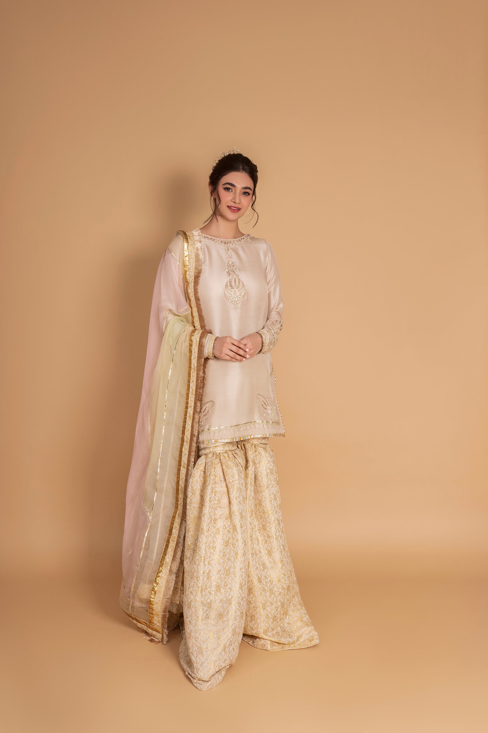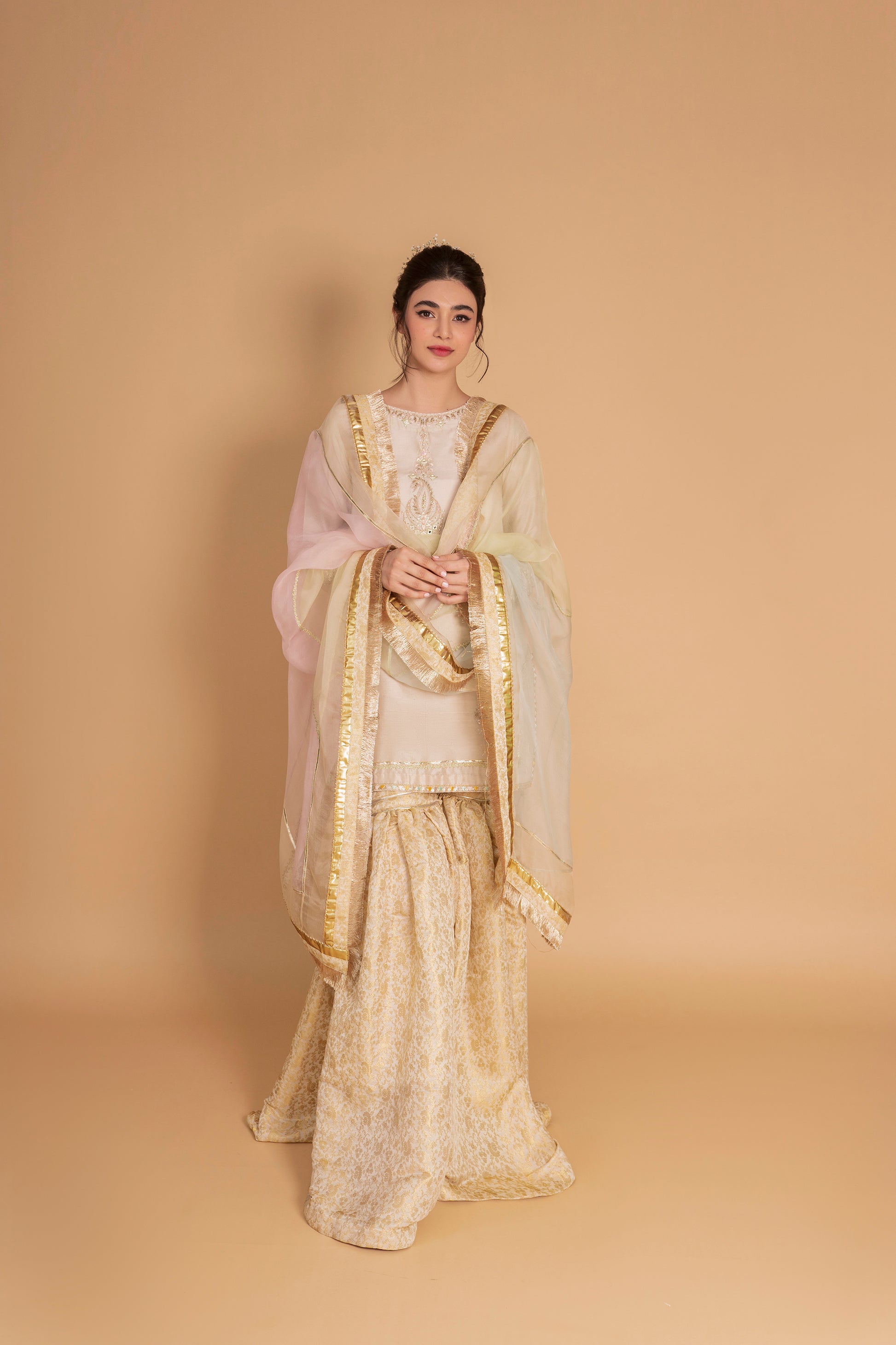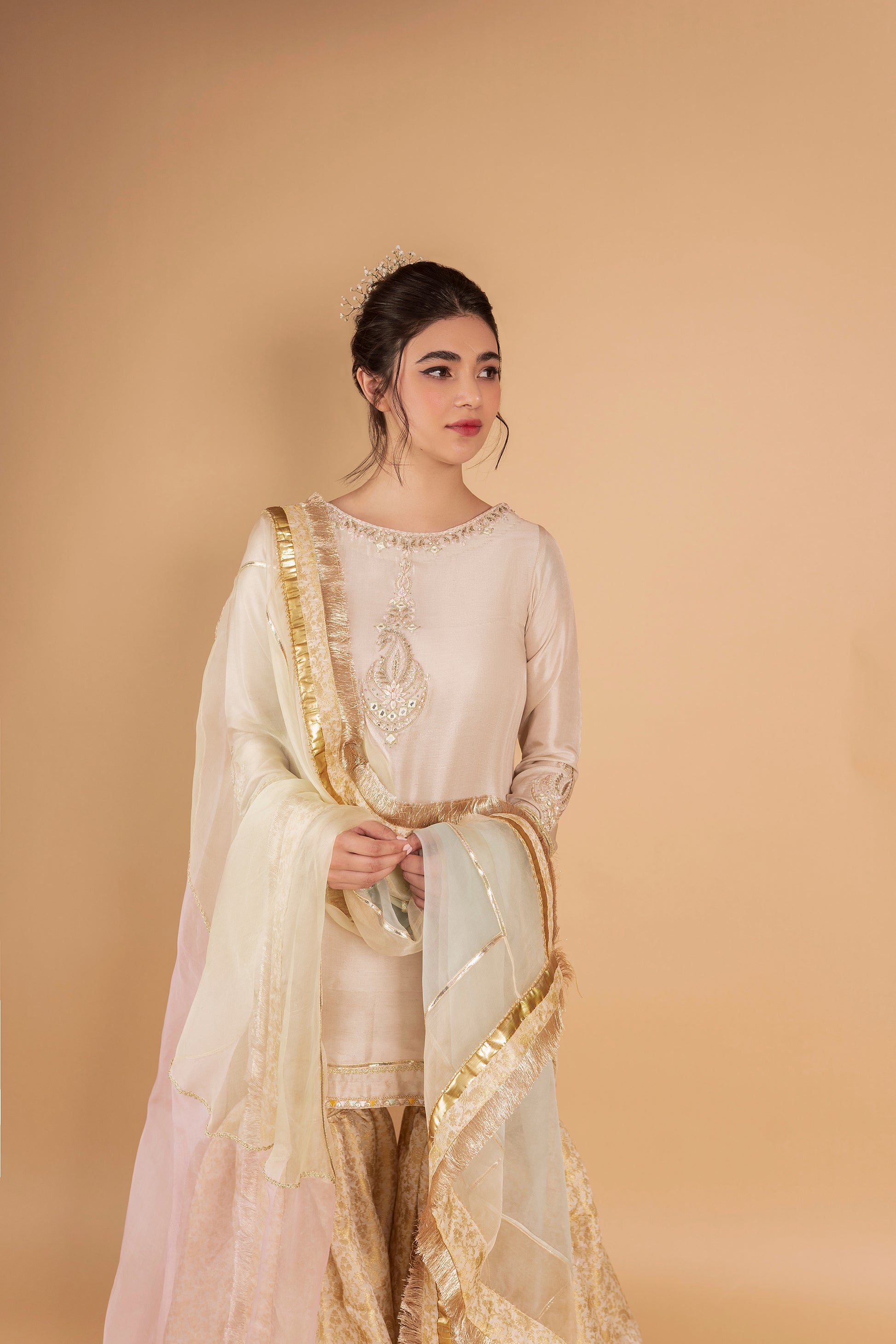 IVORY is a three piece stitched outfit with traditional silk-thread embroidery details on the neckline and sleeves, embellished with hand work, fancy gotta laces and traditional chaand baali motives paired with a classical banarsi gharara.