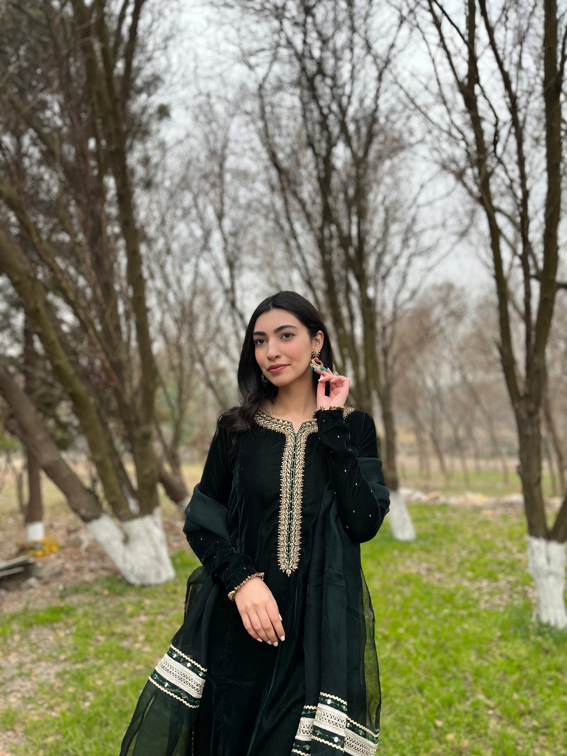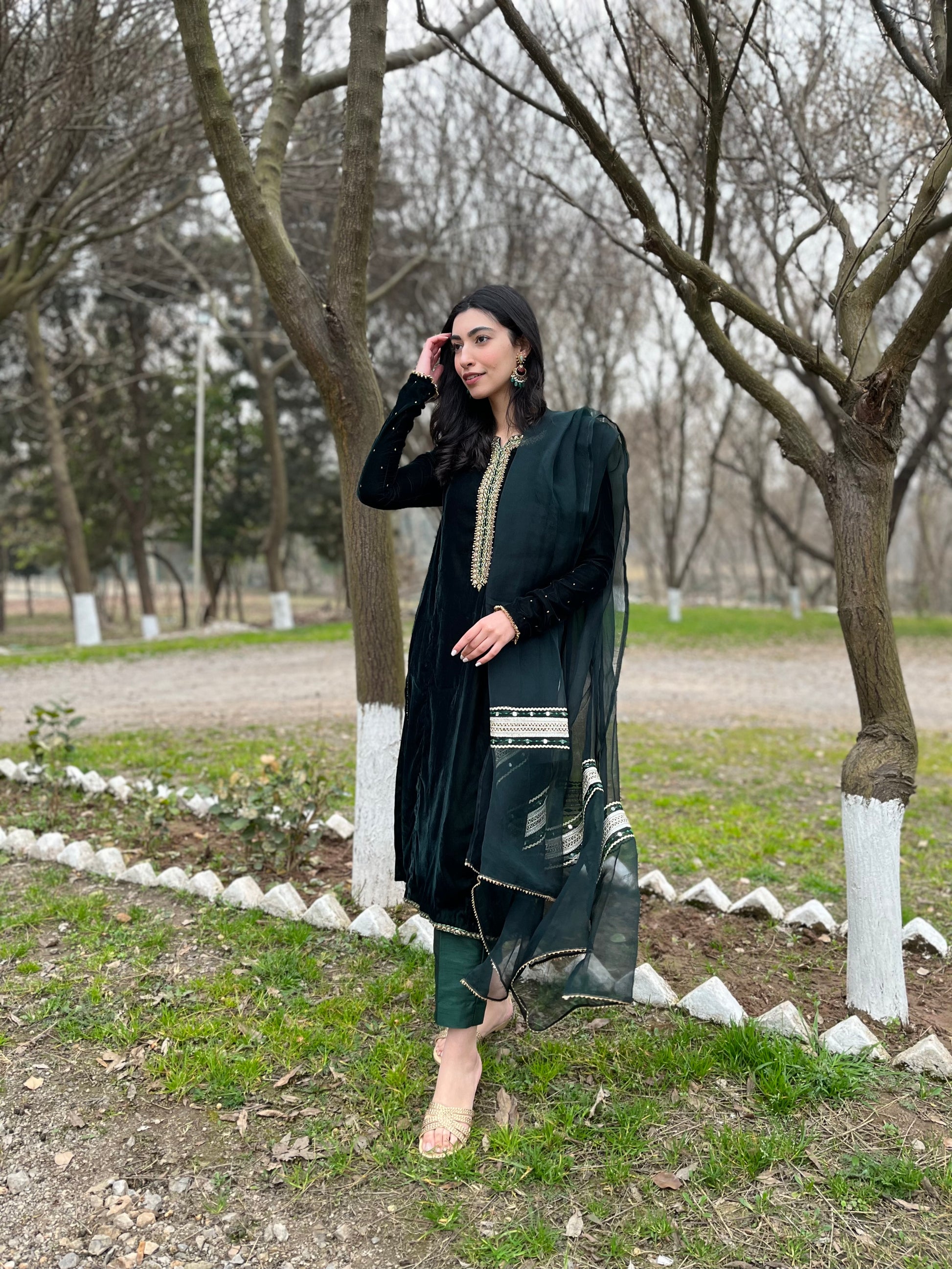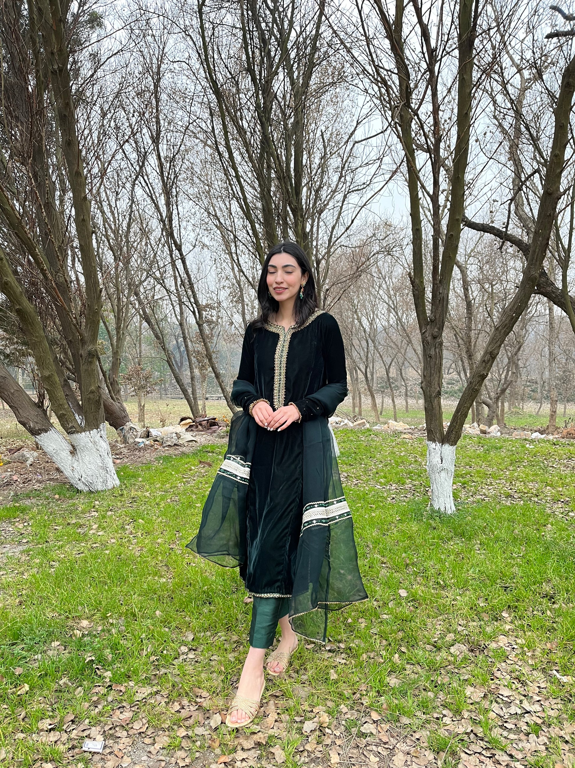 A velvet outfit with an embroidered & hand embellished front paired with straight pants made in Indian raw silk and and intricately designed pure organza dupatta.