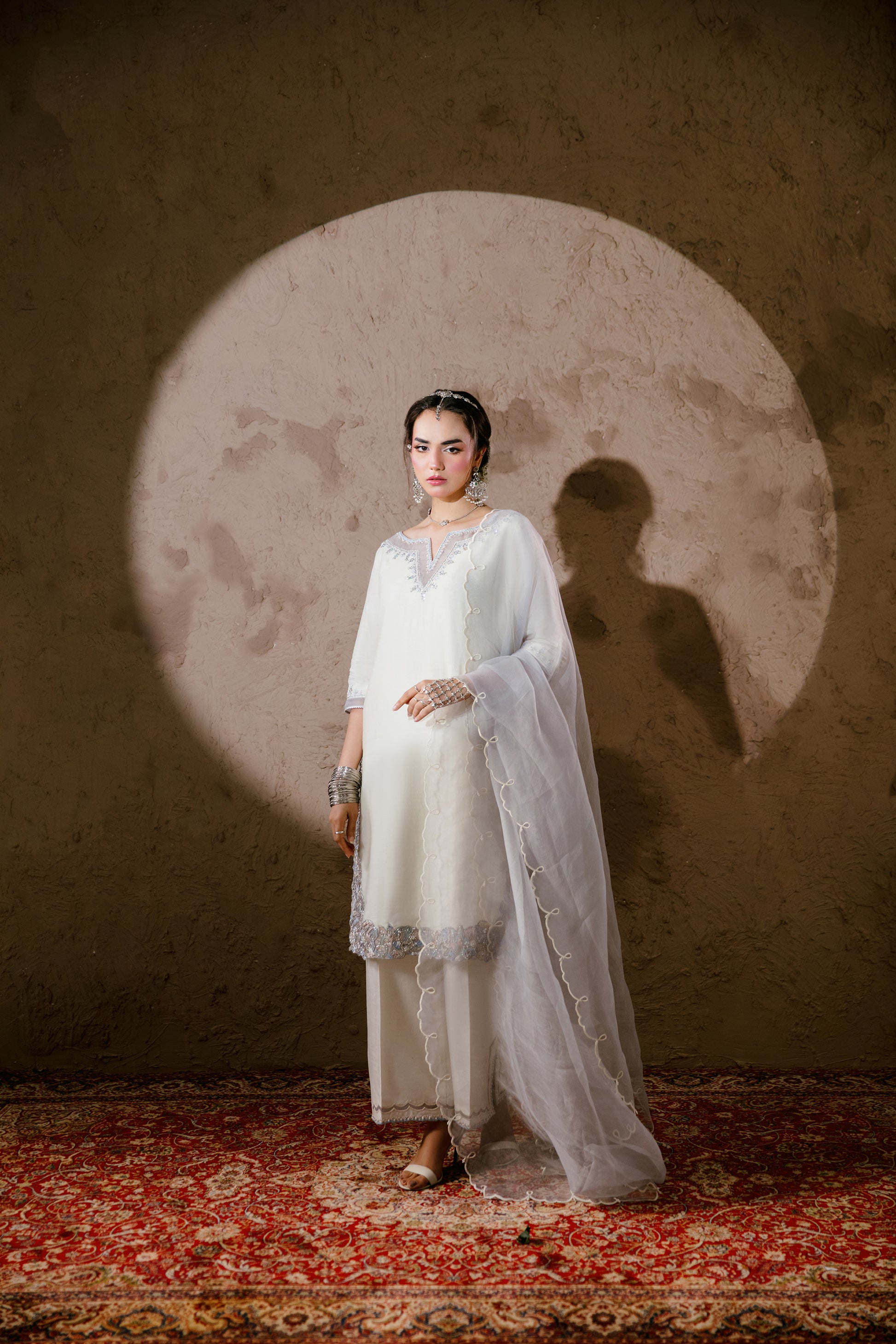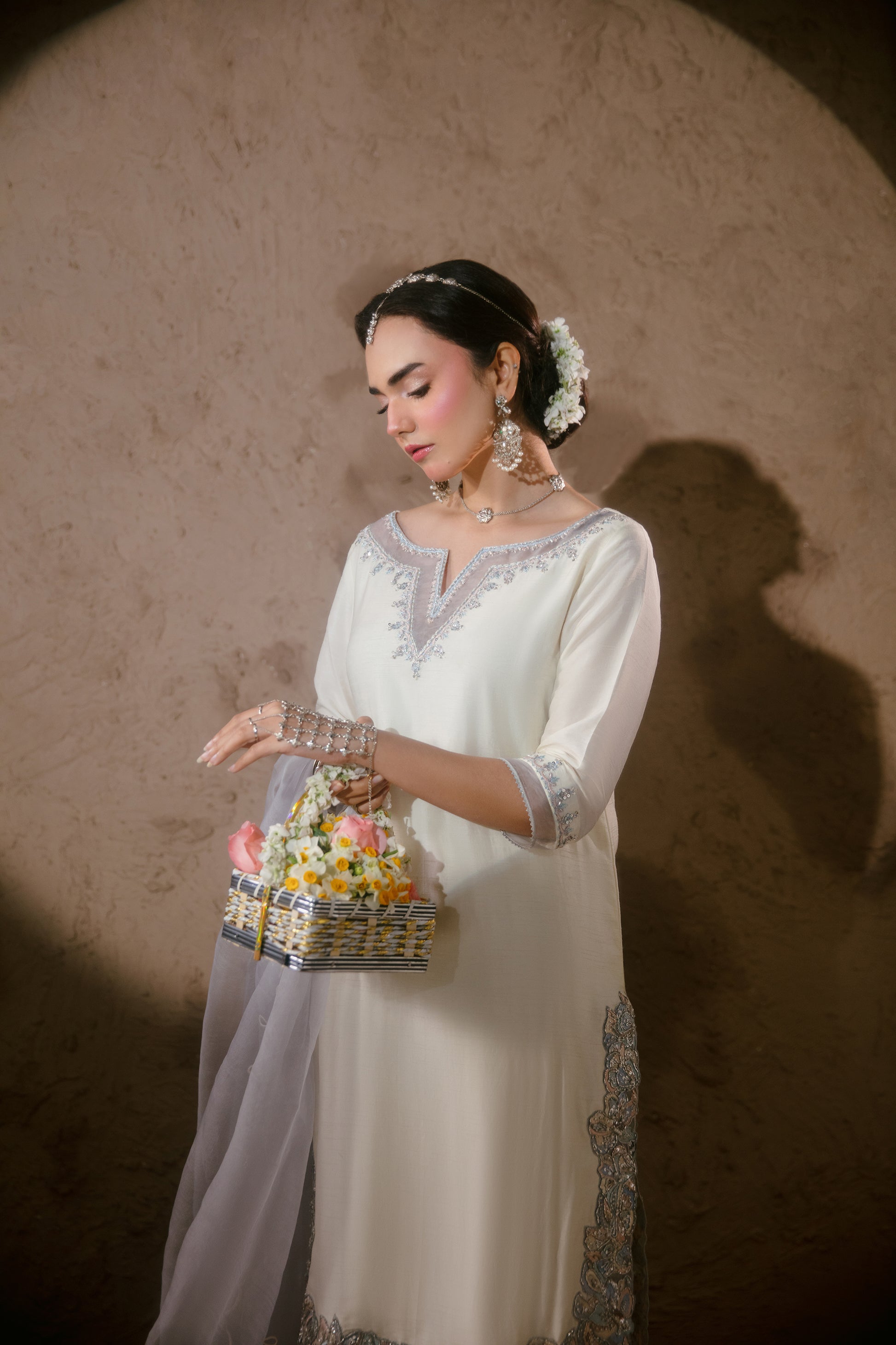 Product Details: Pearl white is a 3 piece stitched outfit made in pure viscous silk. The kurta has its neckline and daman embroidered, front and back, in rehsam embroidery and further adorned with hand-work. It is paired with embroidered pants and scalloped organza dupatta.