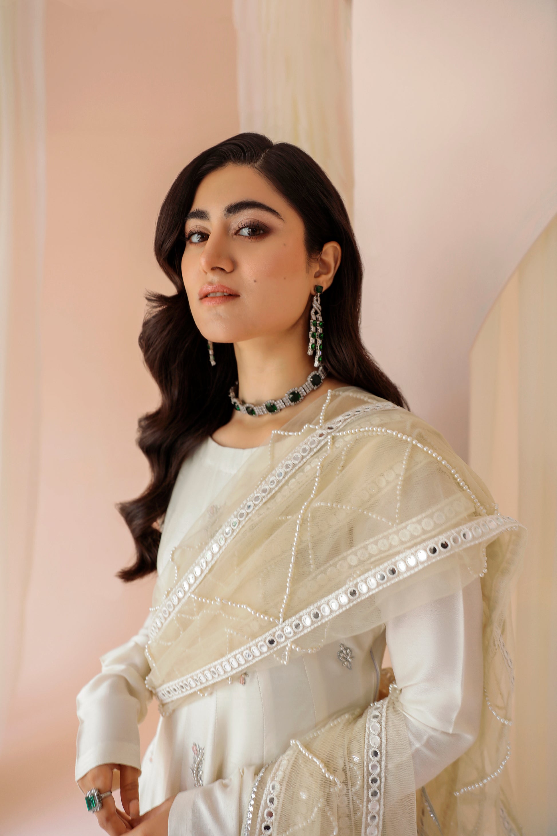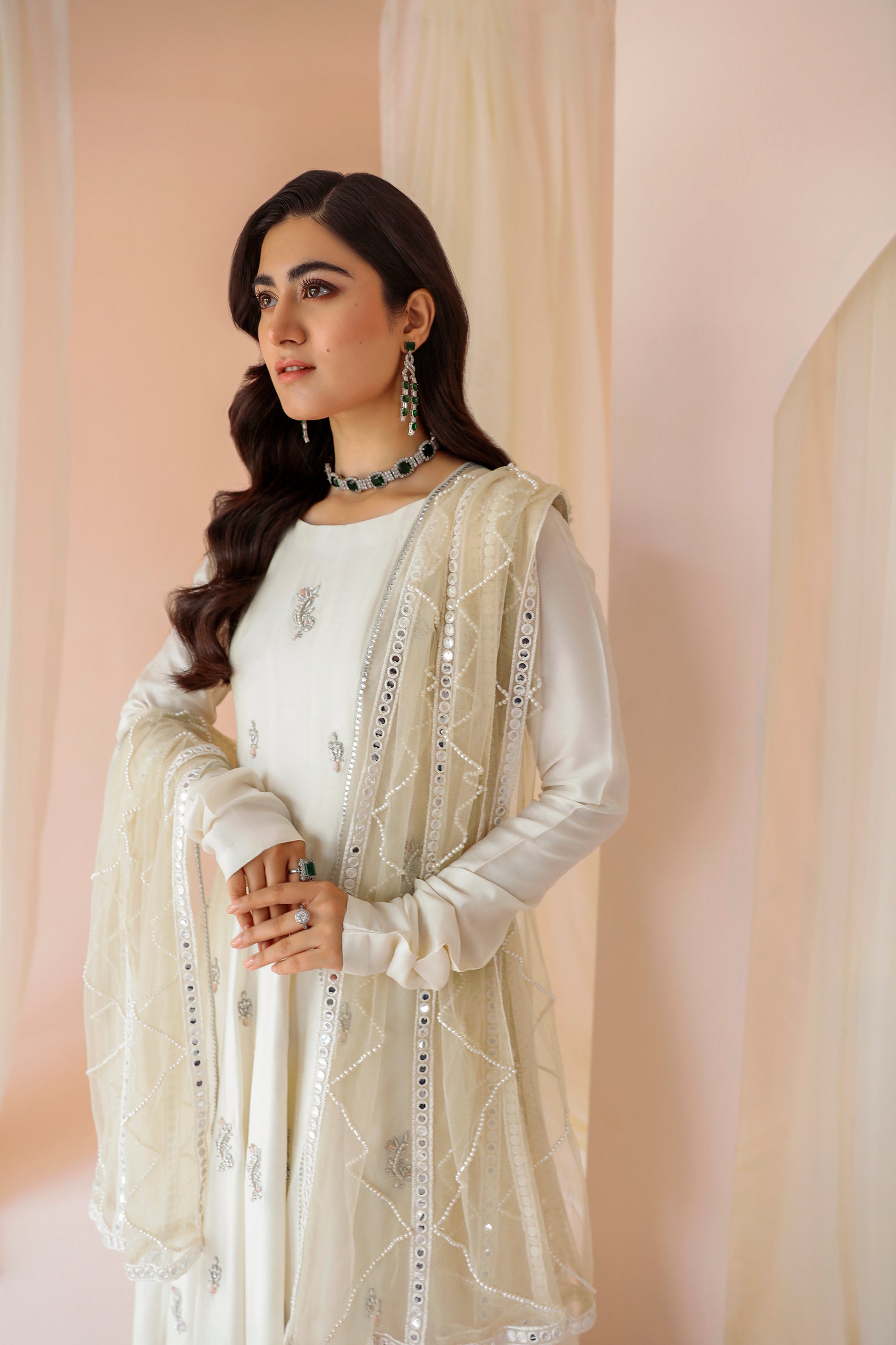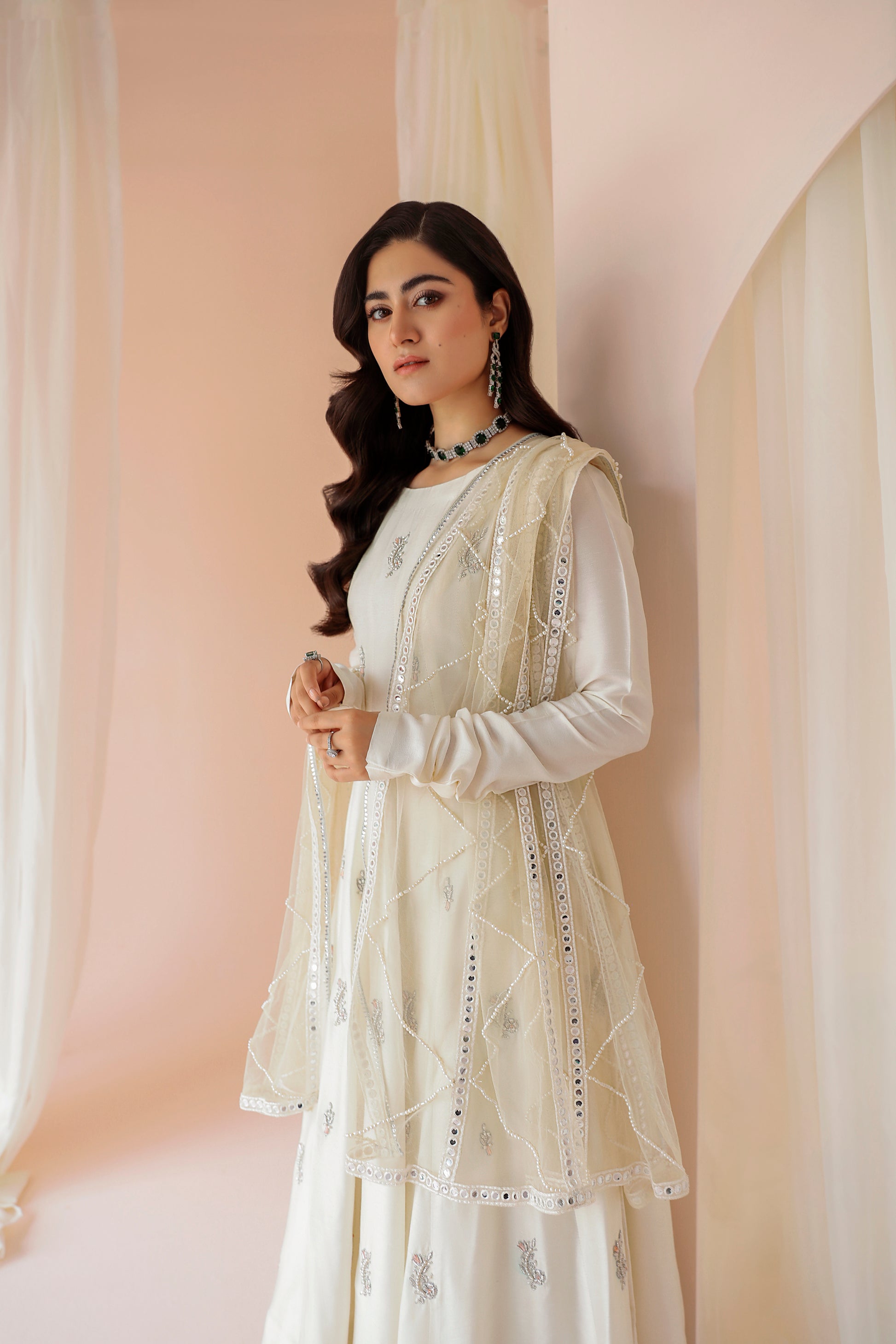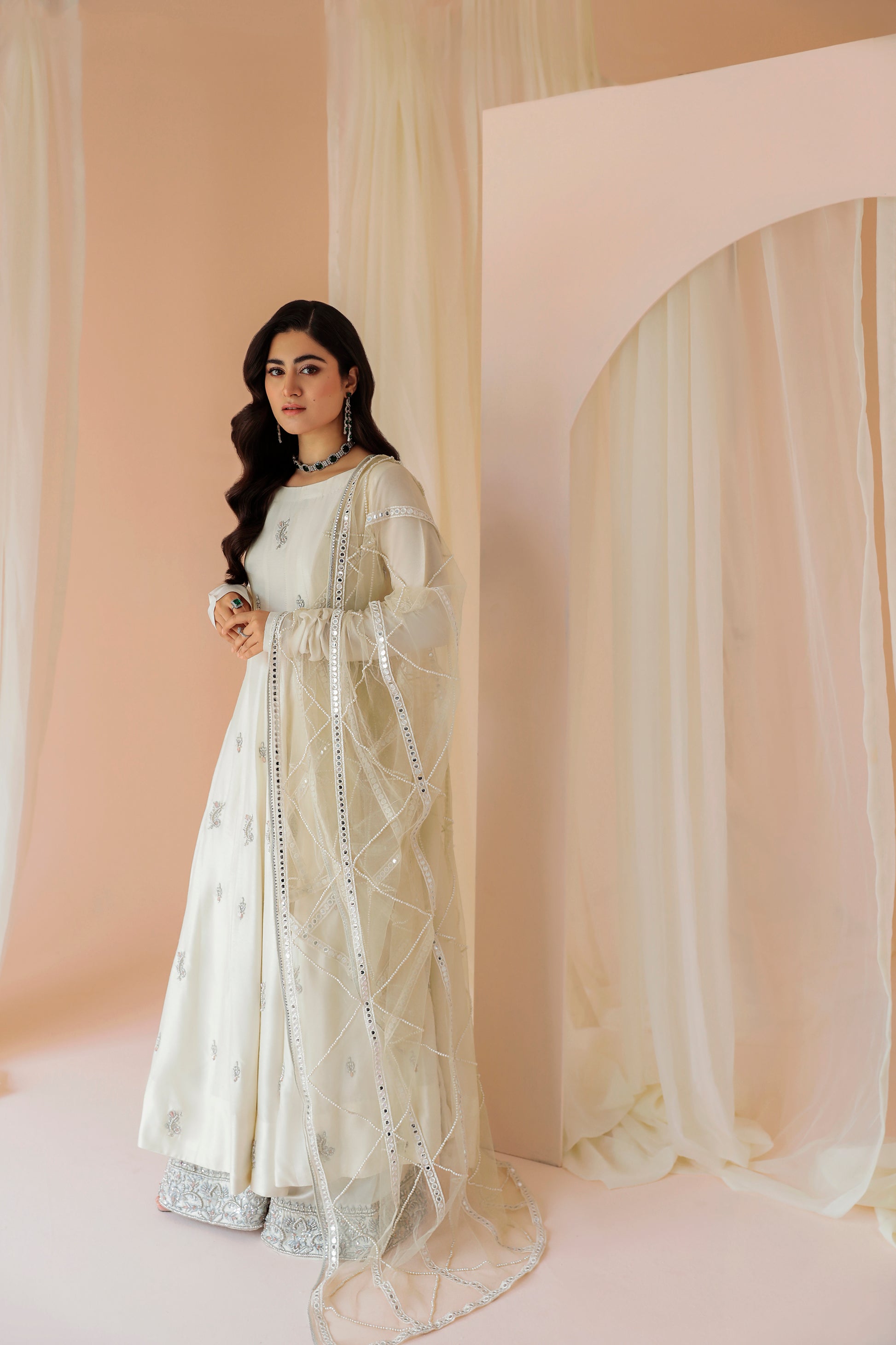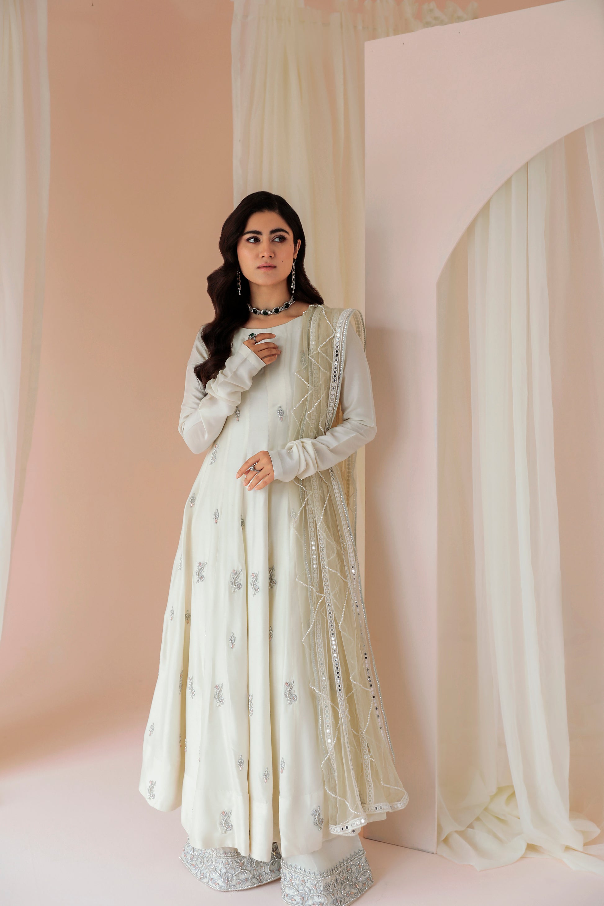 ‘Pearl’ strikes a royal vibe with its rich ivory canvas with a splash of shimmery motif all over, shaped in a carefully designed flared gown constructed with the help of panels and complemented with a hand embroidered bottom.