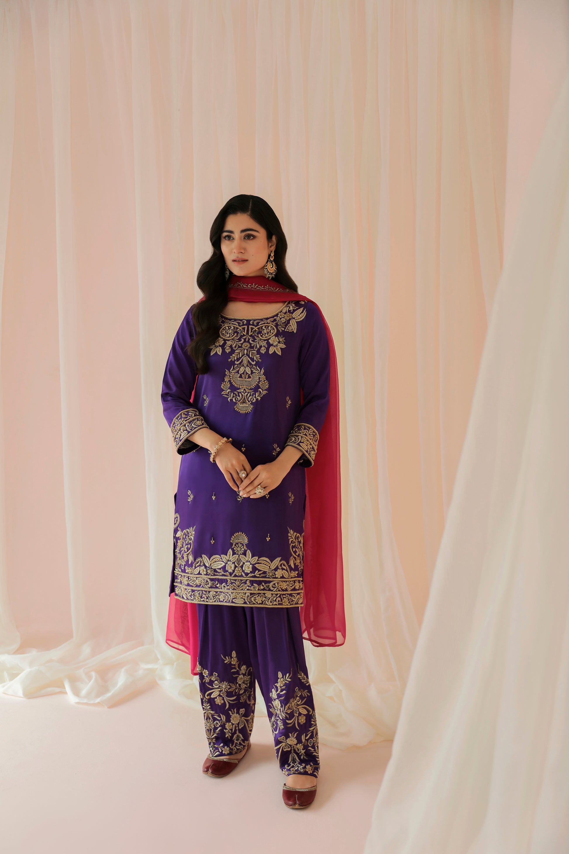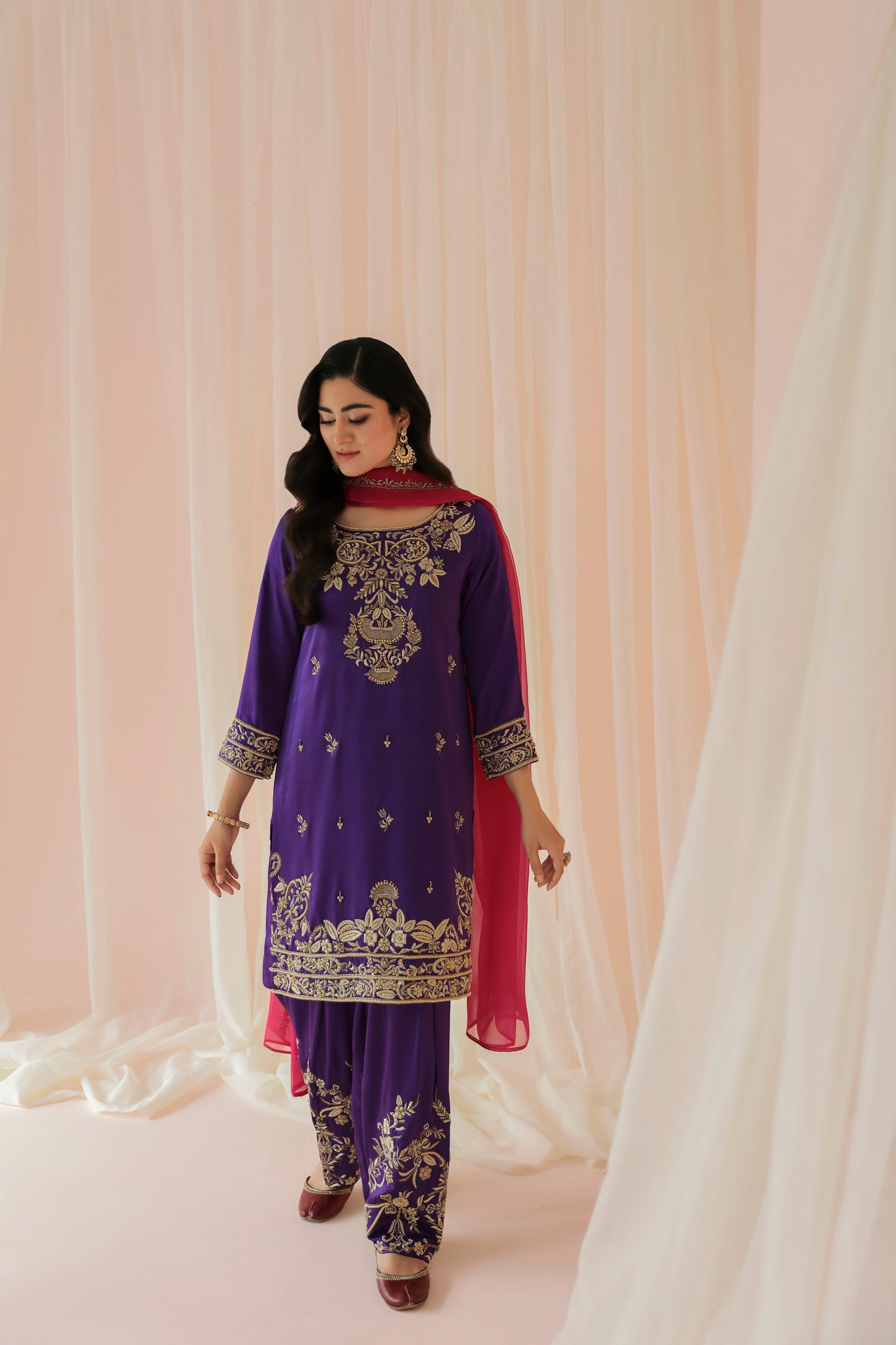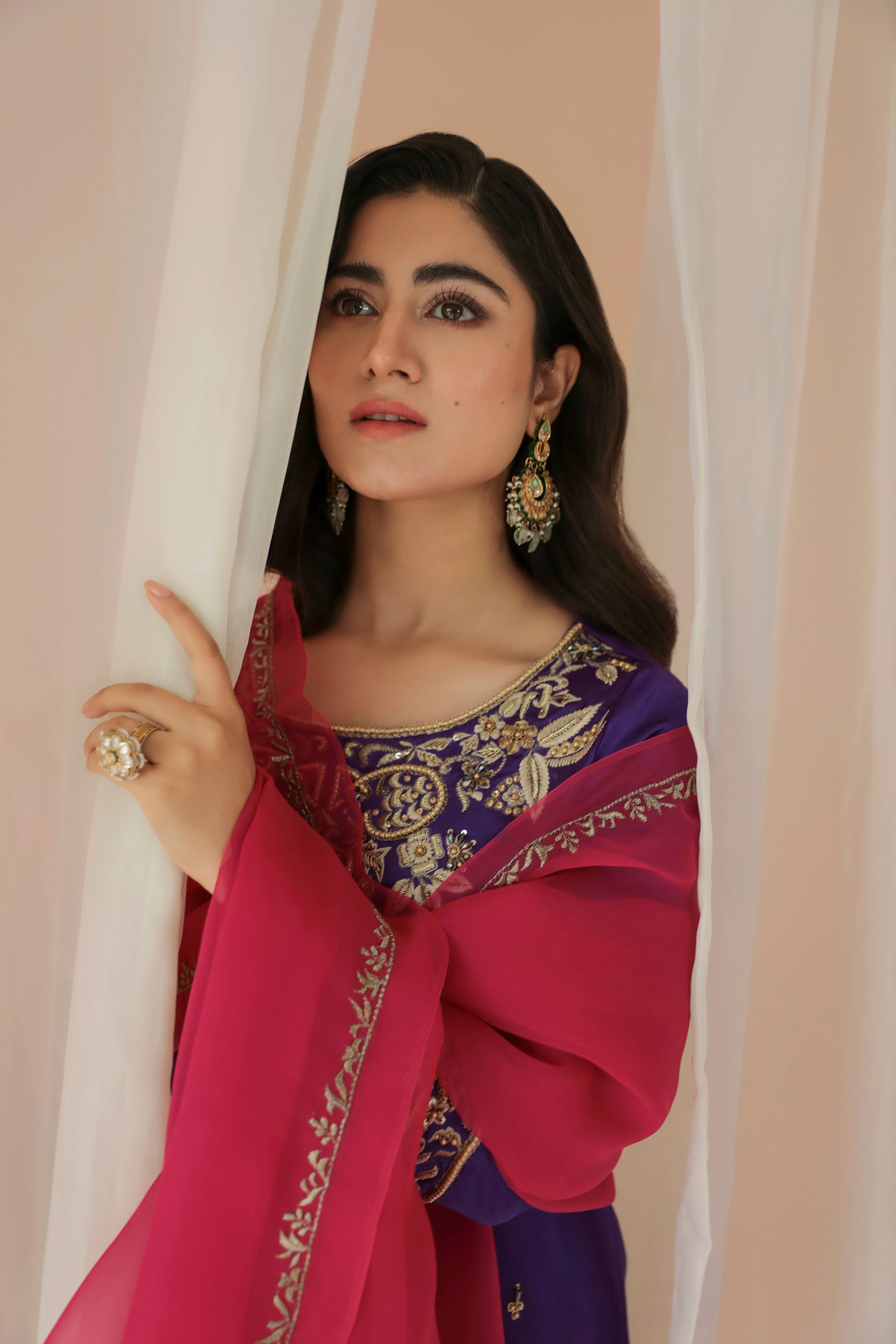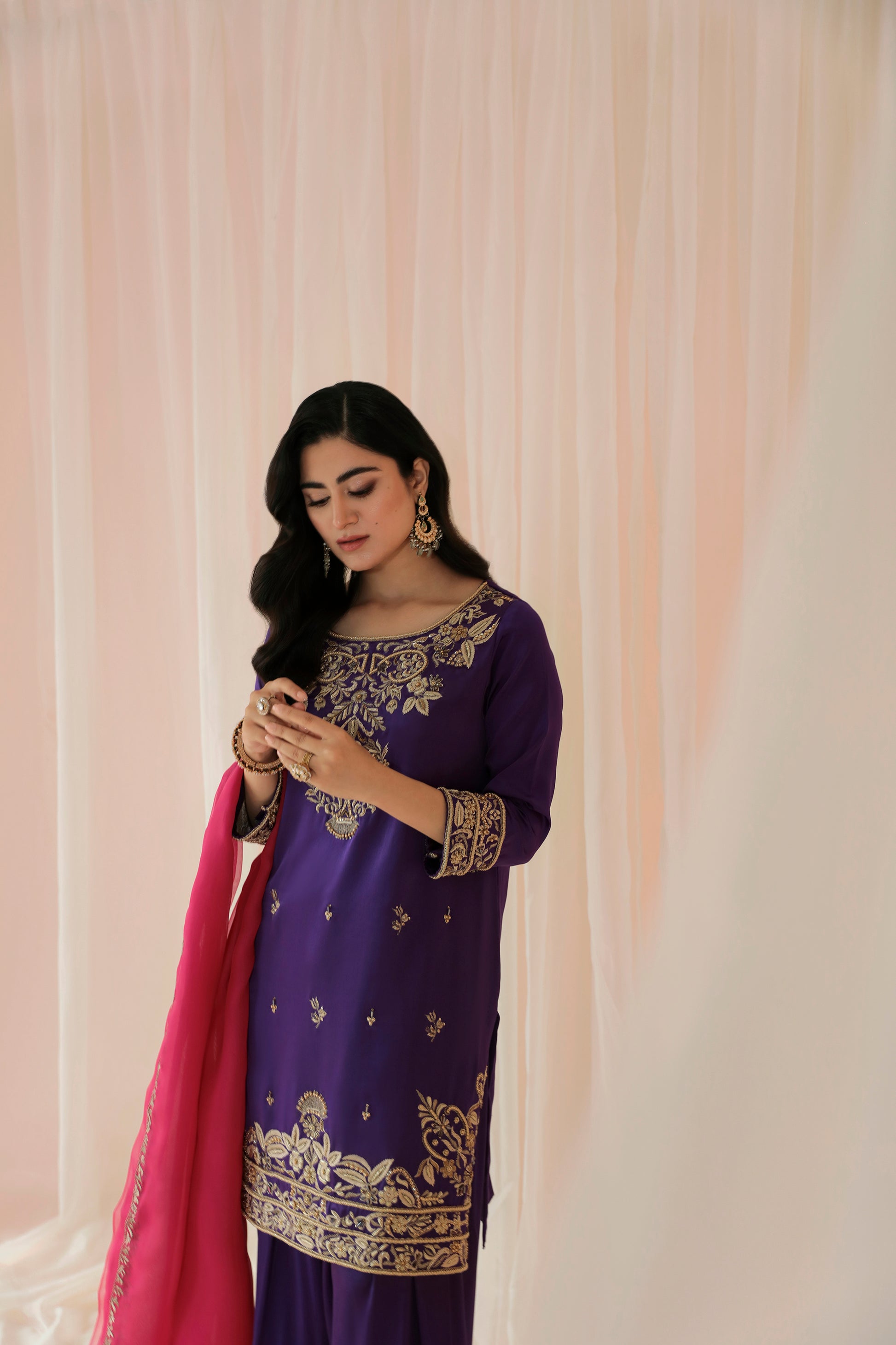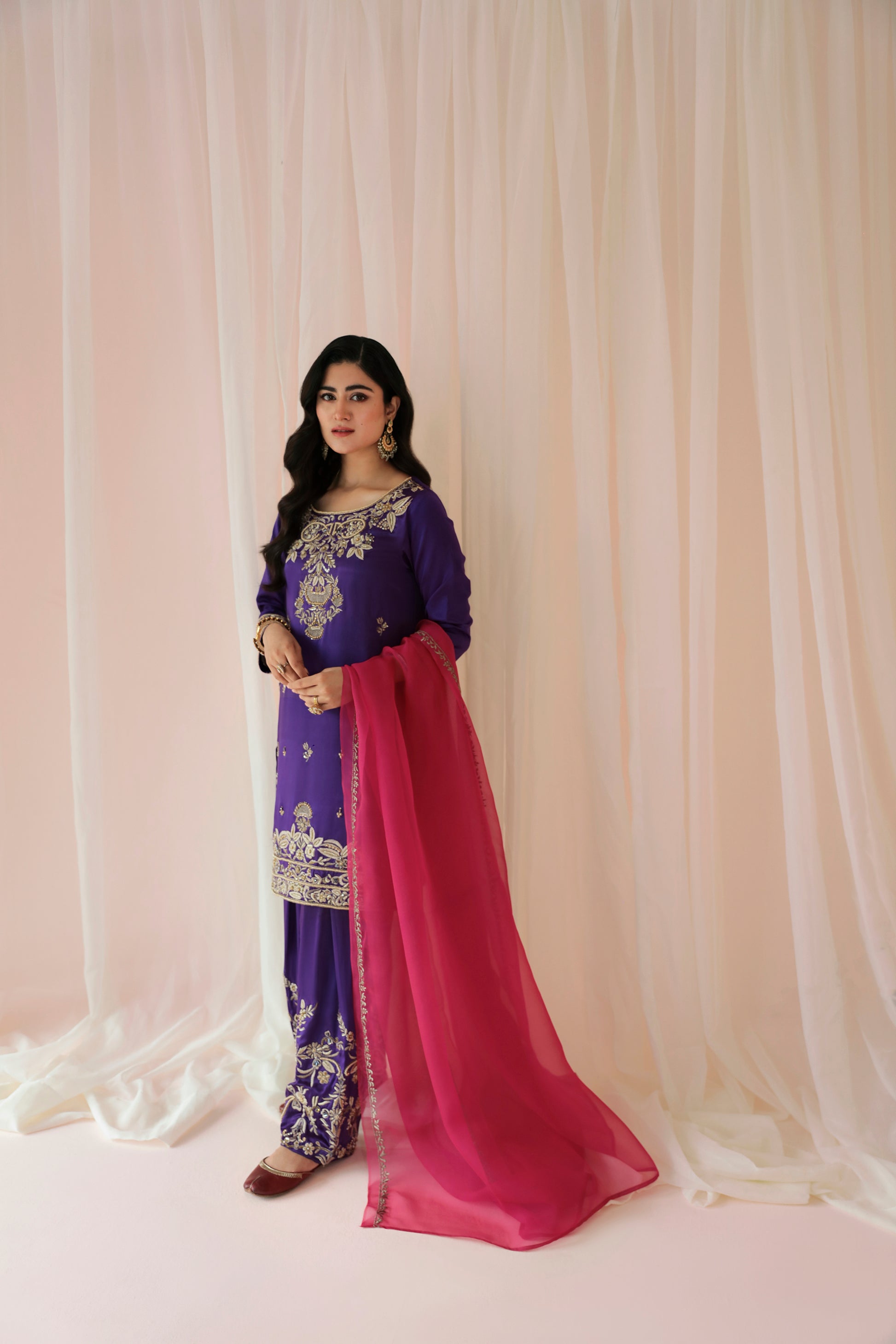 A modern take on a traditional long shirt adorned with a handful of creative embroidery and bling, effortlessly paired with crushed pants and orgazna dupatta.