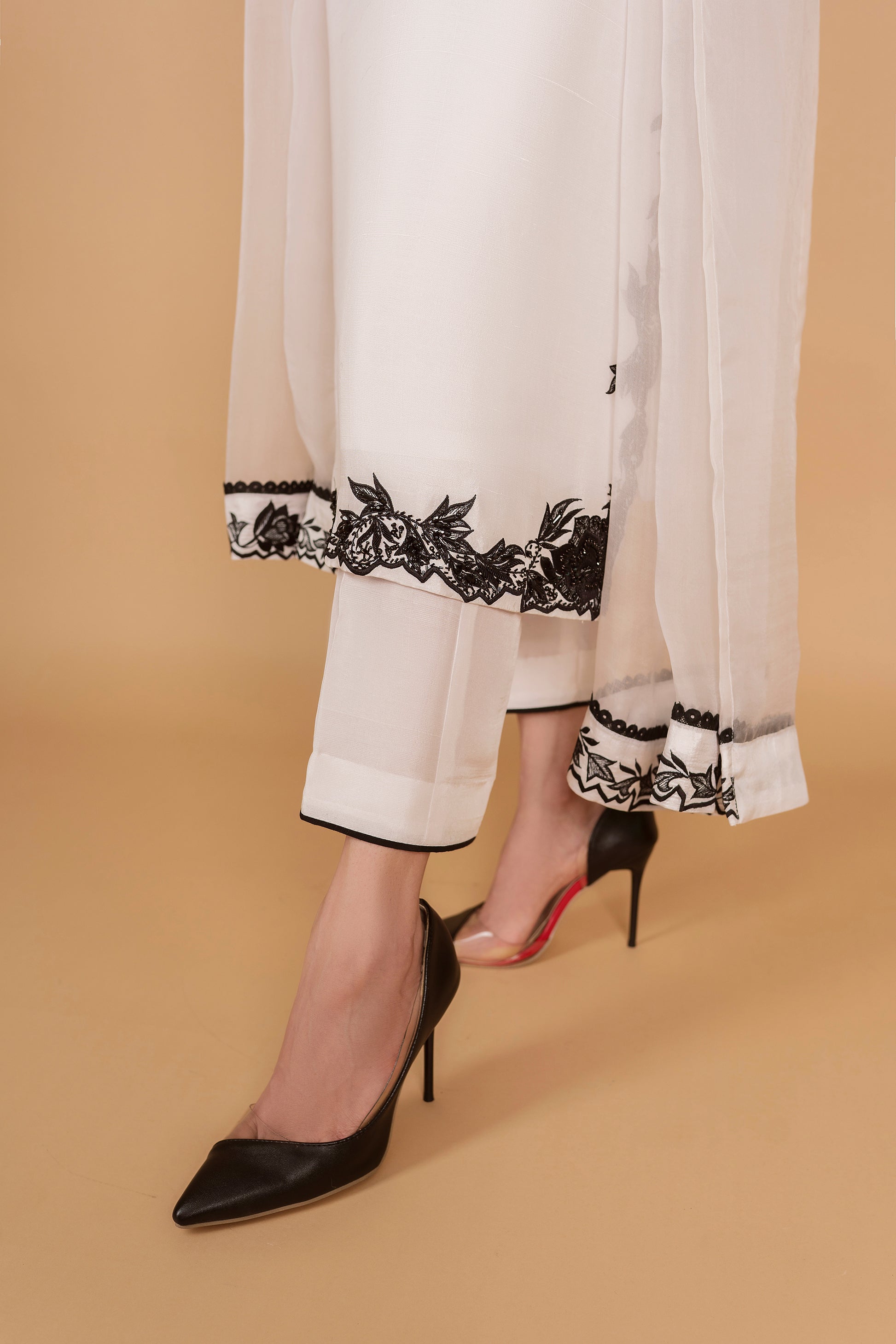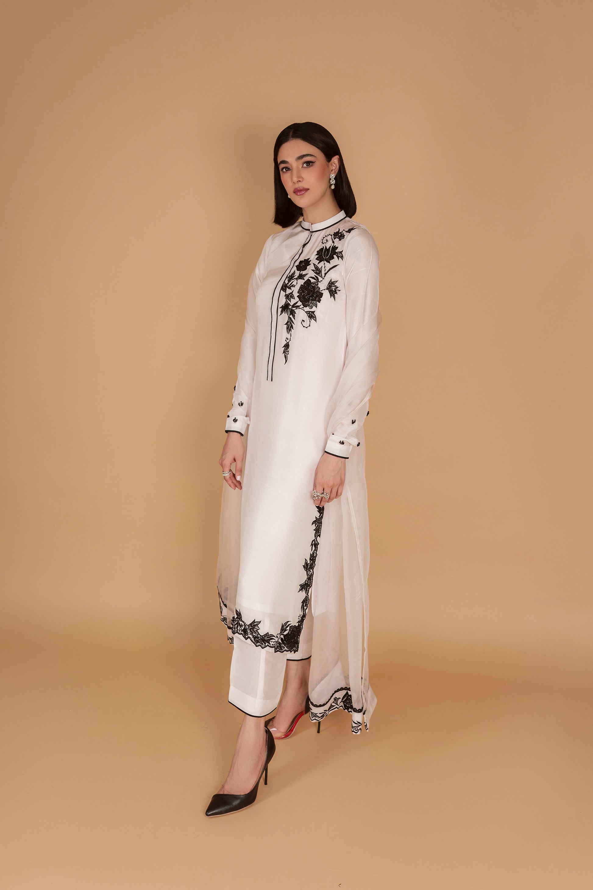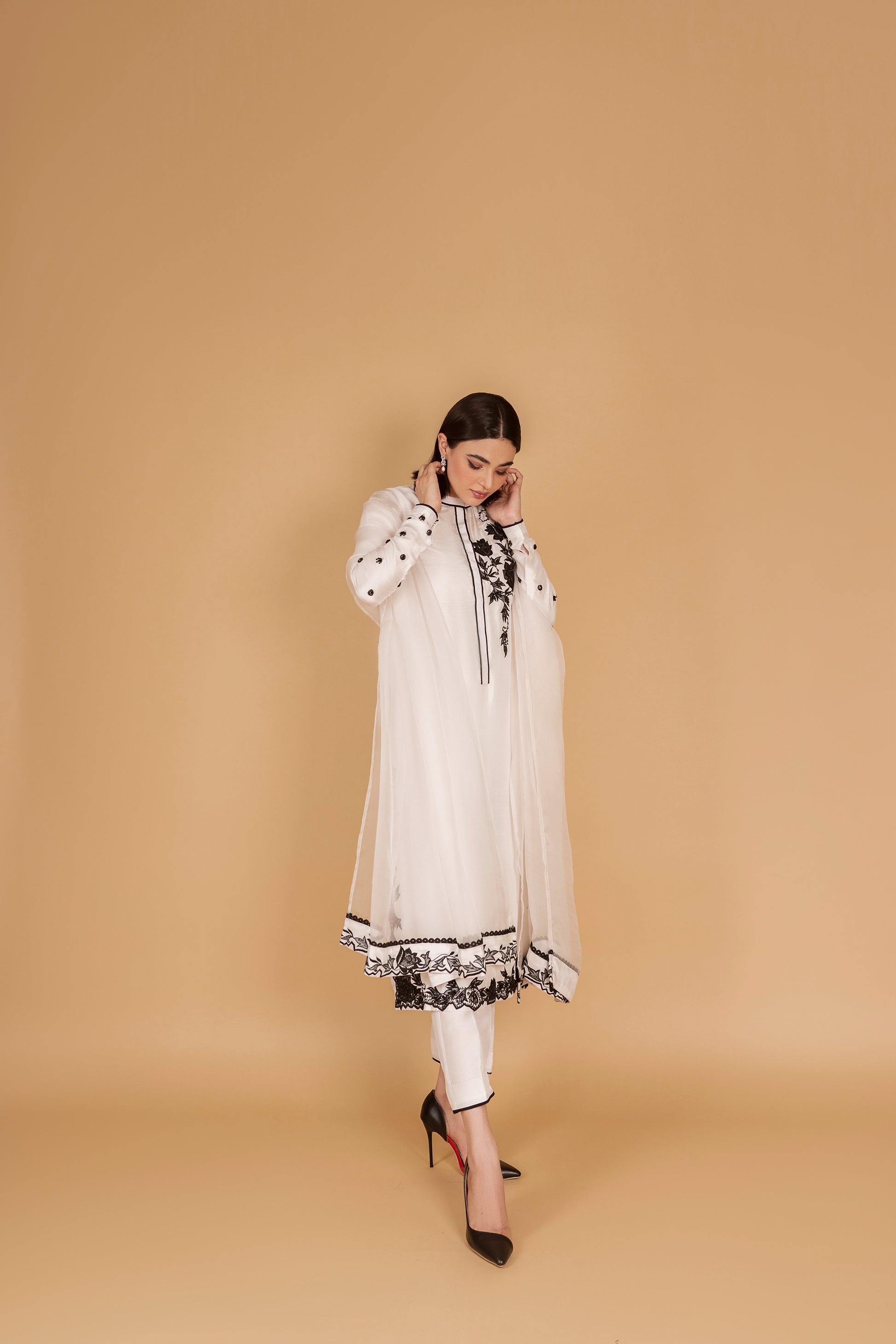 SNOW is 3 piece stitched outfit in a pure raw silk base, silk thread embroidered front and daman, pure organza dupatta with an embroidered patti on the bottom, this entire thread work is further enhanced with embellishment work to make it a perfect pick for your upcoming events this season.