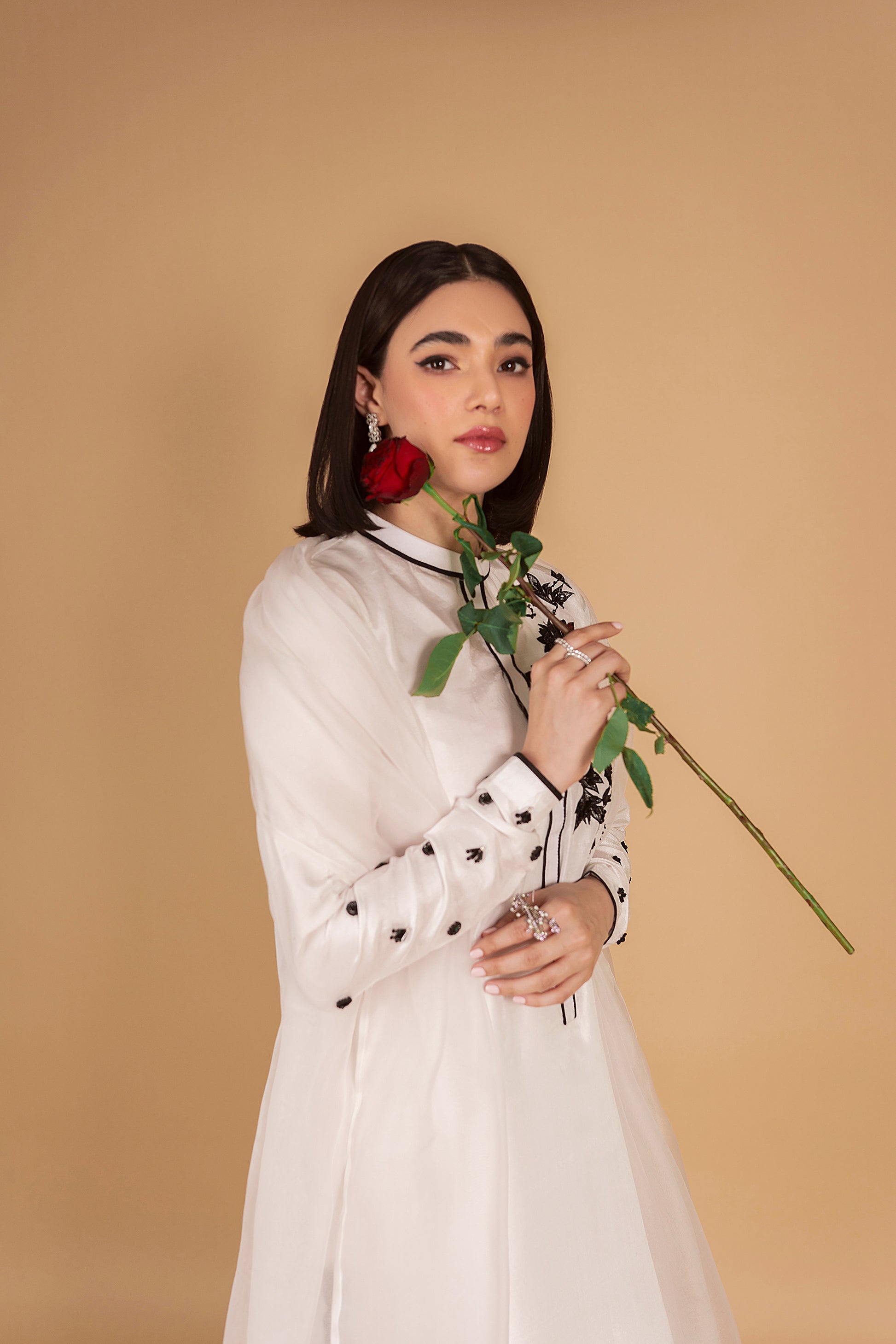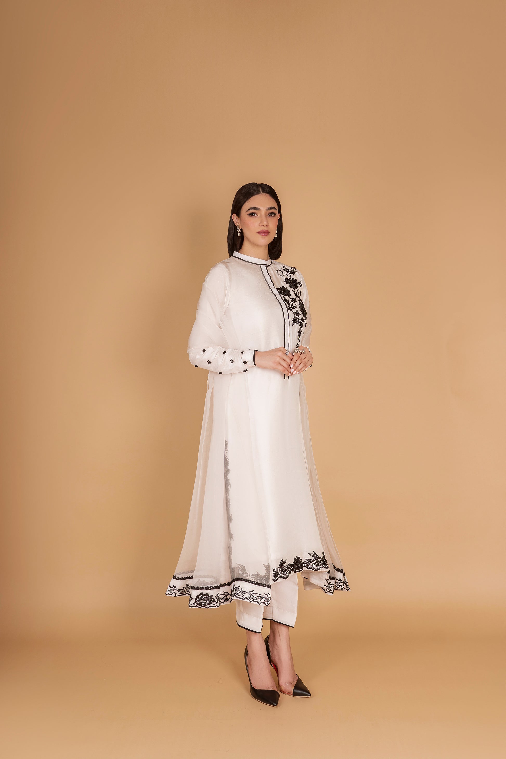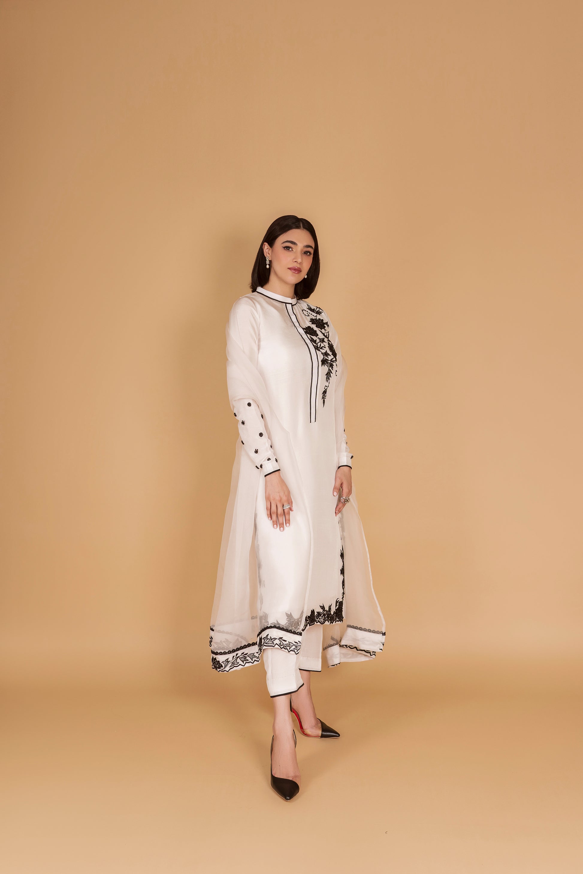 SNOW is 3 piece stitched outfit in a pure raw silk base, silk thread embroidered front and daman, pure organza dupatta with an embroidered patti on the bottom, this entire thread work is further enhanced with embellishment work to make it a perfect pick for your upcoming events this season.