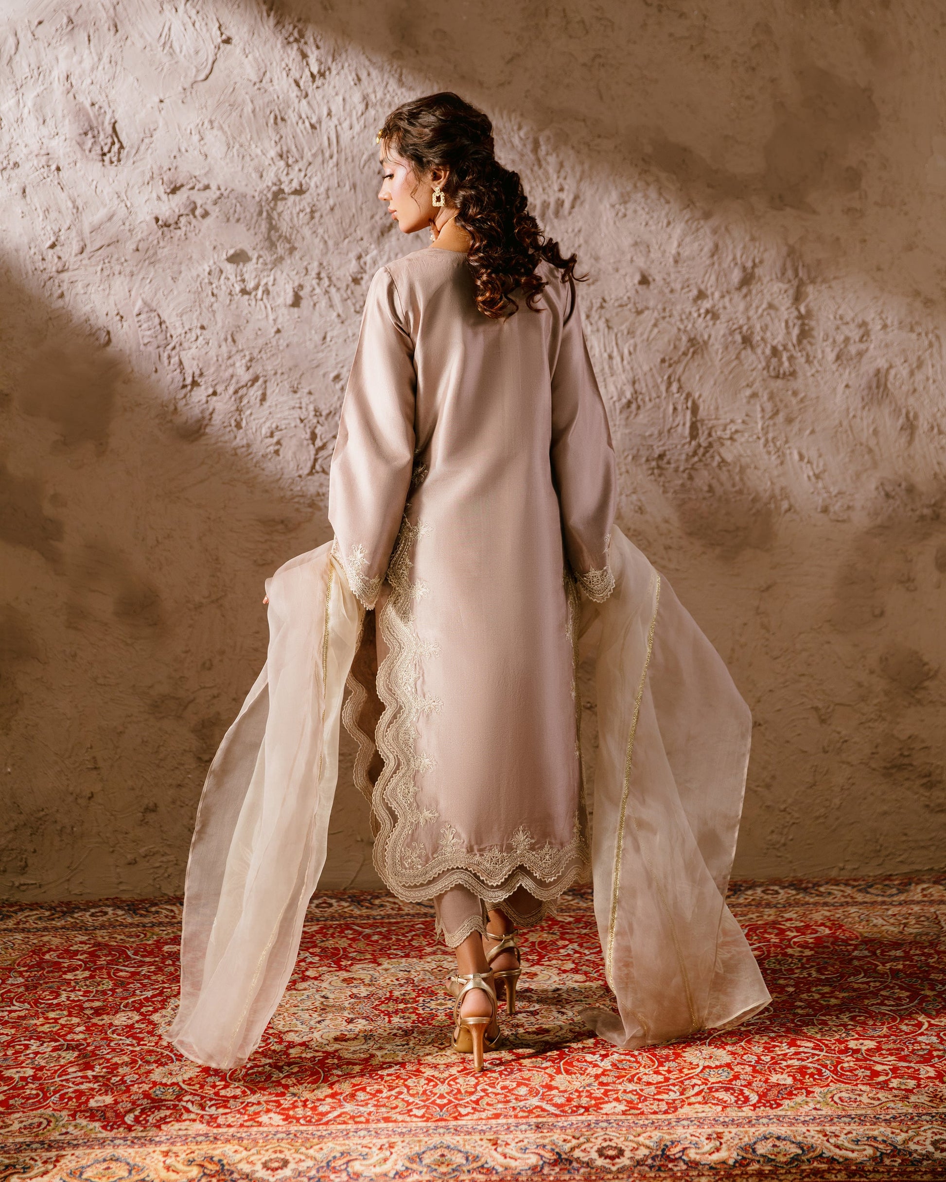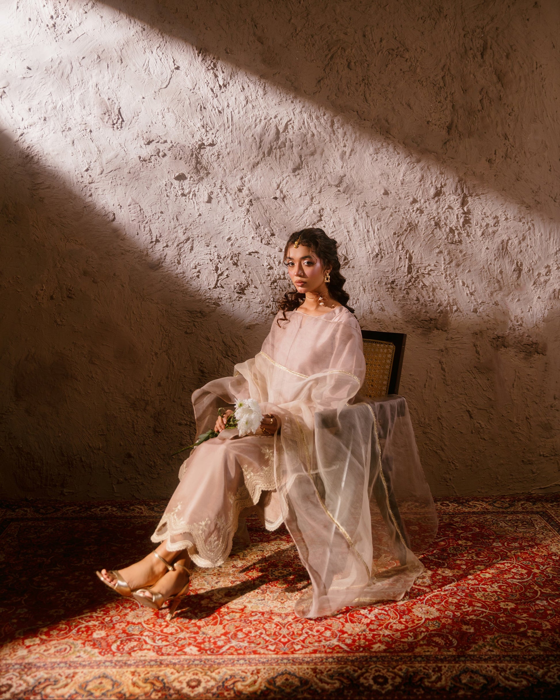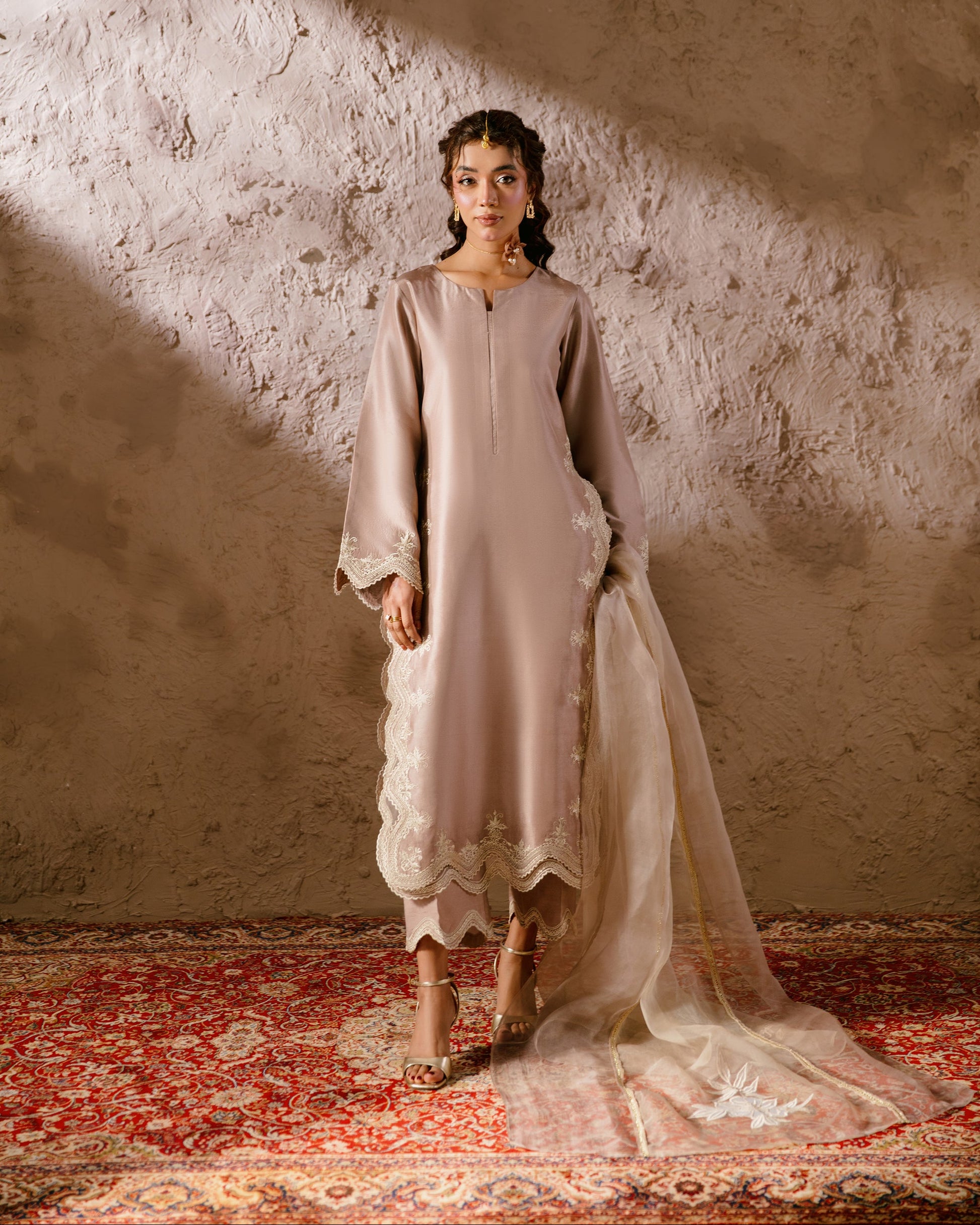 Product Details: A soft tea-pink silk ensemble, rich in embroidery all around the shirt, exquisitely double-layered with scalloped organza - paired with straight pants and a detailed organza dupatta. You can't resist the richness of this fit this Eid.